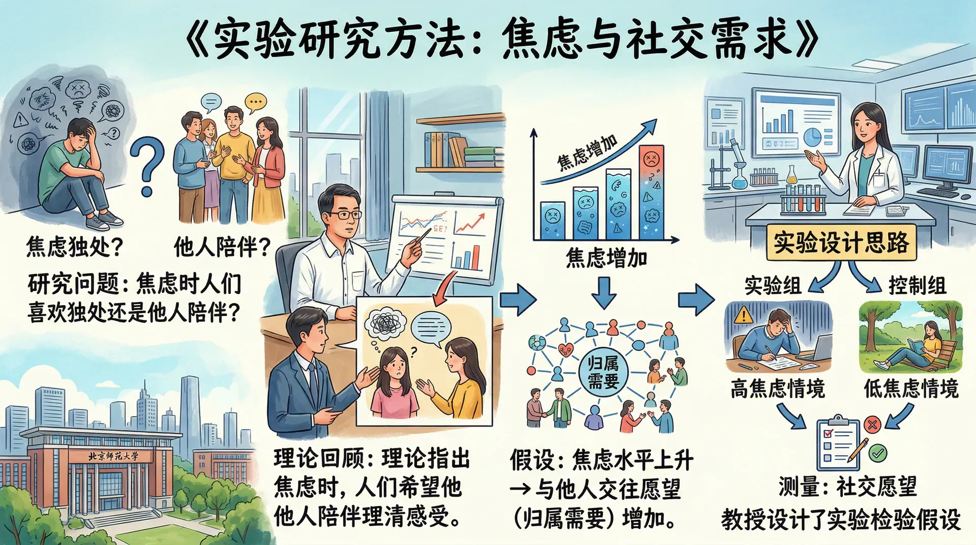 人们在感到焦虑时,是喜欢独处还是希望有他人陪伴?这个问题引起了北京师范大学社会心理学家李教授的兴趣。对相关理论的回顾表明,在焦虑时期,人们会希望有其他人在身边帮助他们理清自己的感受。因此,他的假设是焦虑的增加会导致与他人交往愿望的增加,心理学家称之为归属需要。为了检验这个假设,李教授设计了一个巧妙的实验。