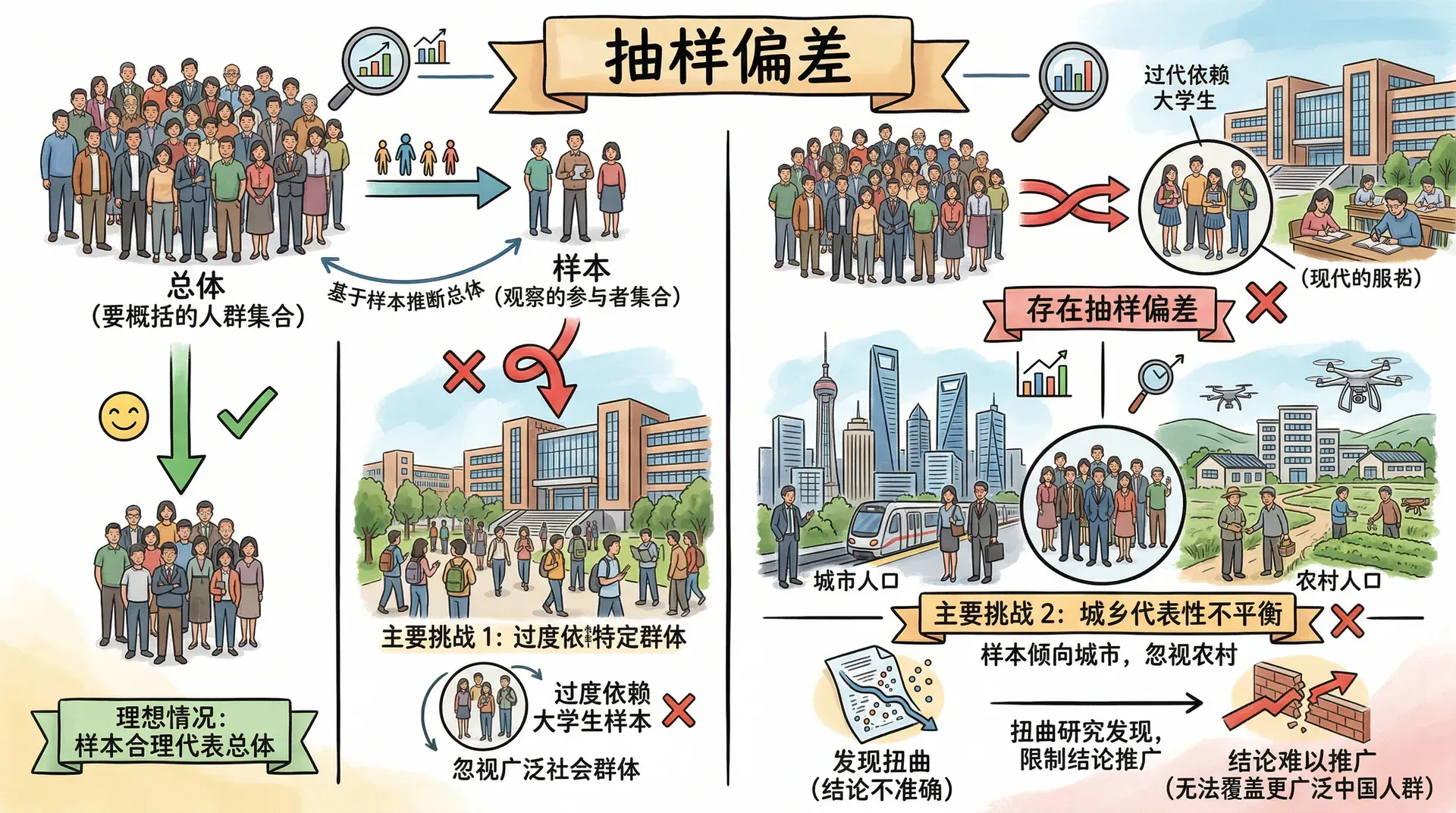 样本是为在实证研究中进行观察而选择的参与者集合,总体是研究者想要概括的更大的人群集合。实证研究总是涉及基于样本对总体进行统计推断,这一策略建立在样本合理代表总体的假设上。当样本不代表从中抽取的总体时,就存在抽样偏差。近年来,中国心理学家在样本构成方面面临挑战,研究者发现大多数心理学研究过度依赖大学生样本,城乡代表性不平衡。这种对特定群体的过度依赖可能在许多研究领域扭曲发现,使得研究结论难以推广到更广泛的中国人群。