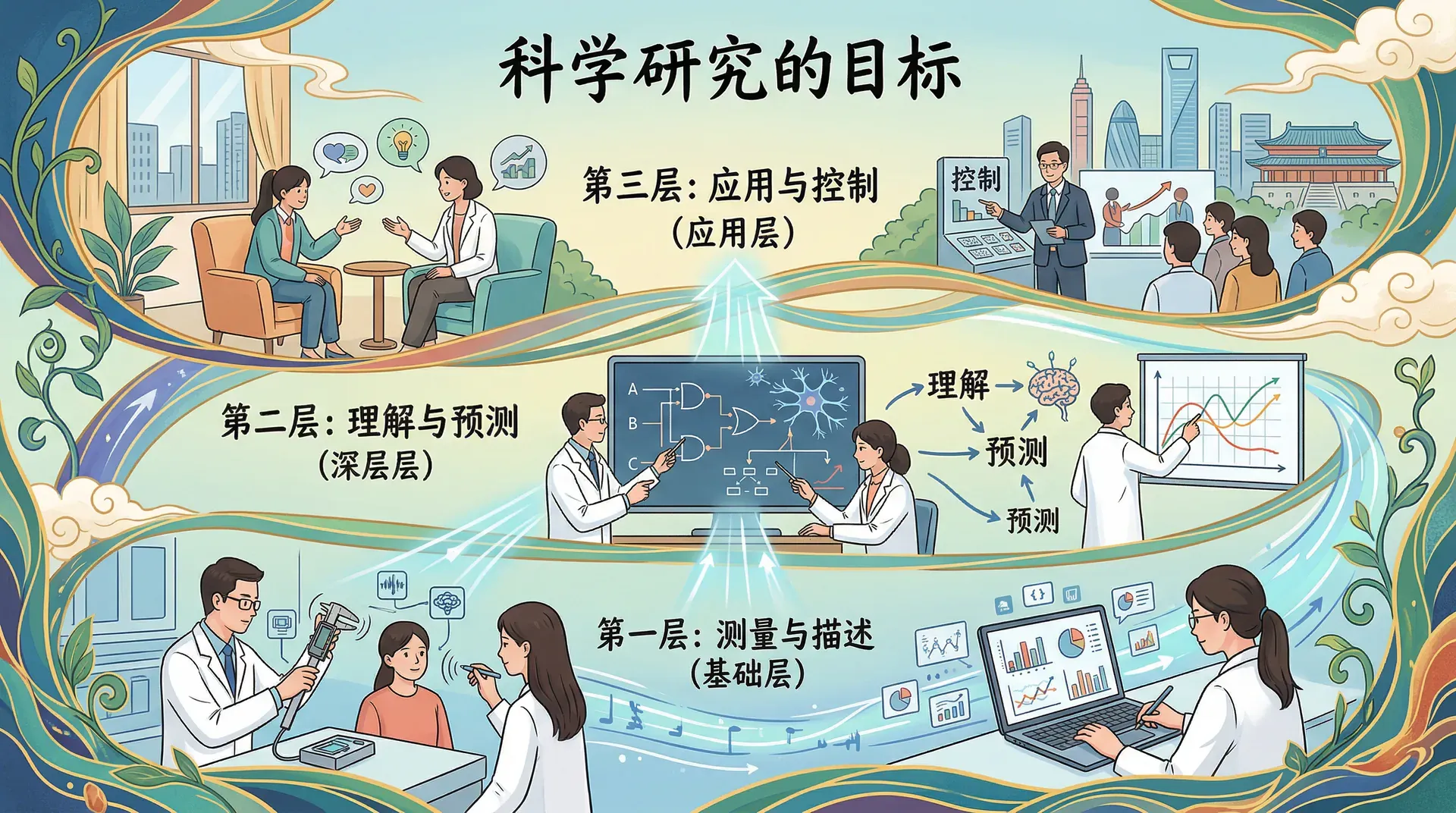 心理学家和其他科学家共同追求三组相互关联的目标:测量与描述、理解与预测、应用与控制。这三个层次的目标相互依存,从基础的观察记录,到深层的原因解释,再到实际问题的解决,构成了心理学研究的完整框架。