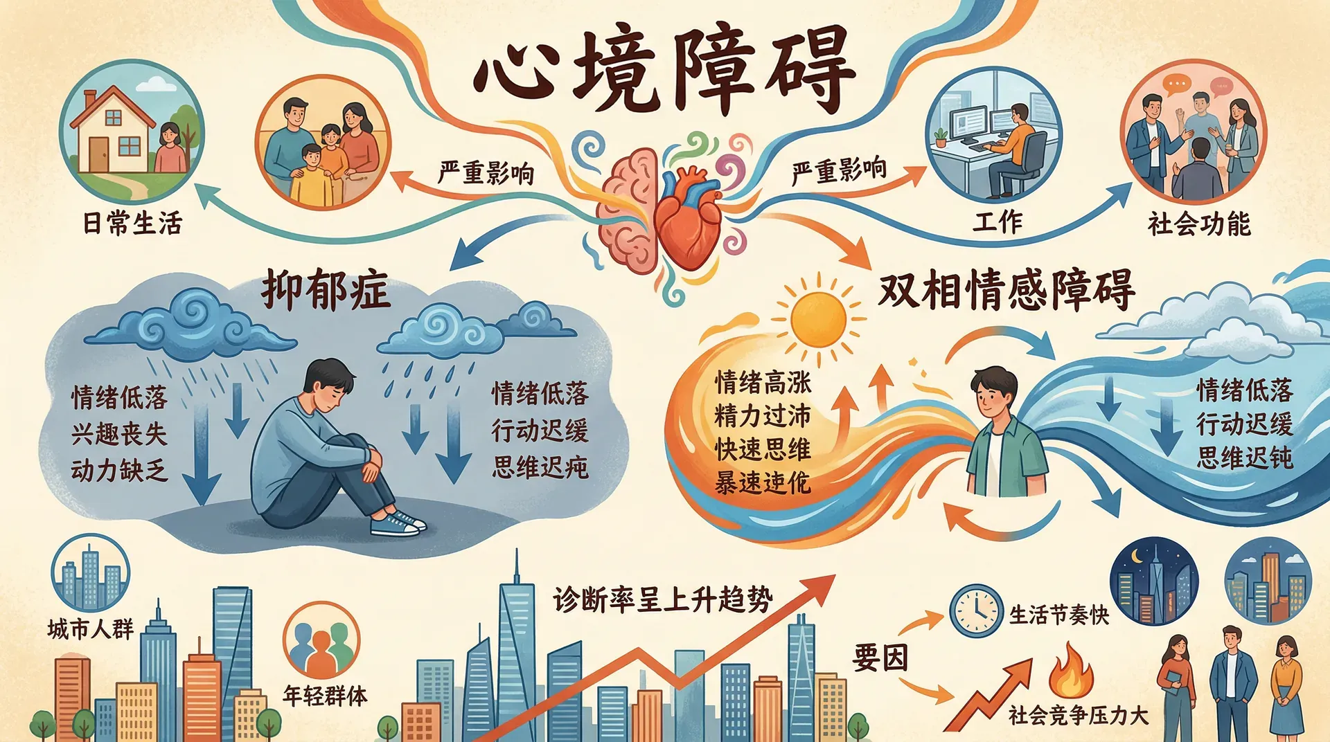心境障碍是以情绪异常为主要特征的一类心理障碍,患者的情绪状态出现显著且持续的异常变化,严重影响日常生活、工作和社会功能。主要包括抑郁症和双相情感障碍两大类。在中国,随着社会竞争压力增加、生活节奏加快,心境障碍的诊断率呈上升趋势,特别是在城市人群和年轻群体中更为明显。
