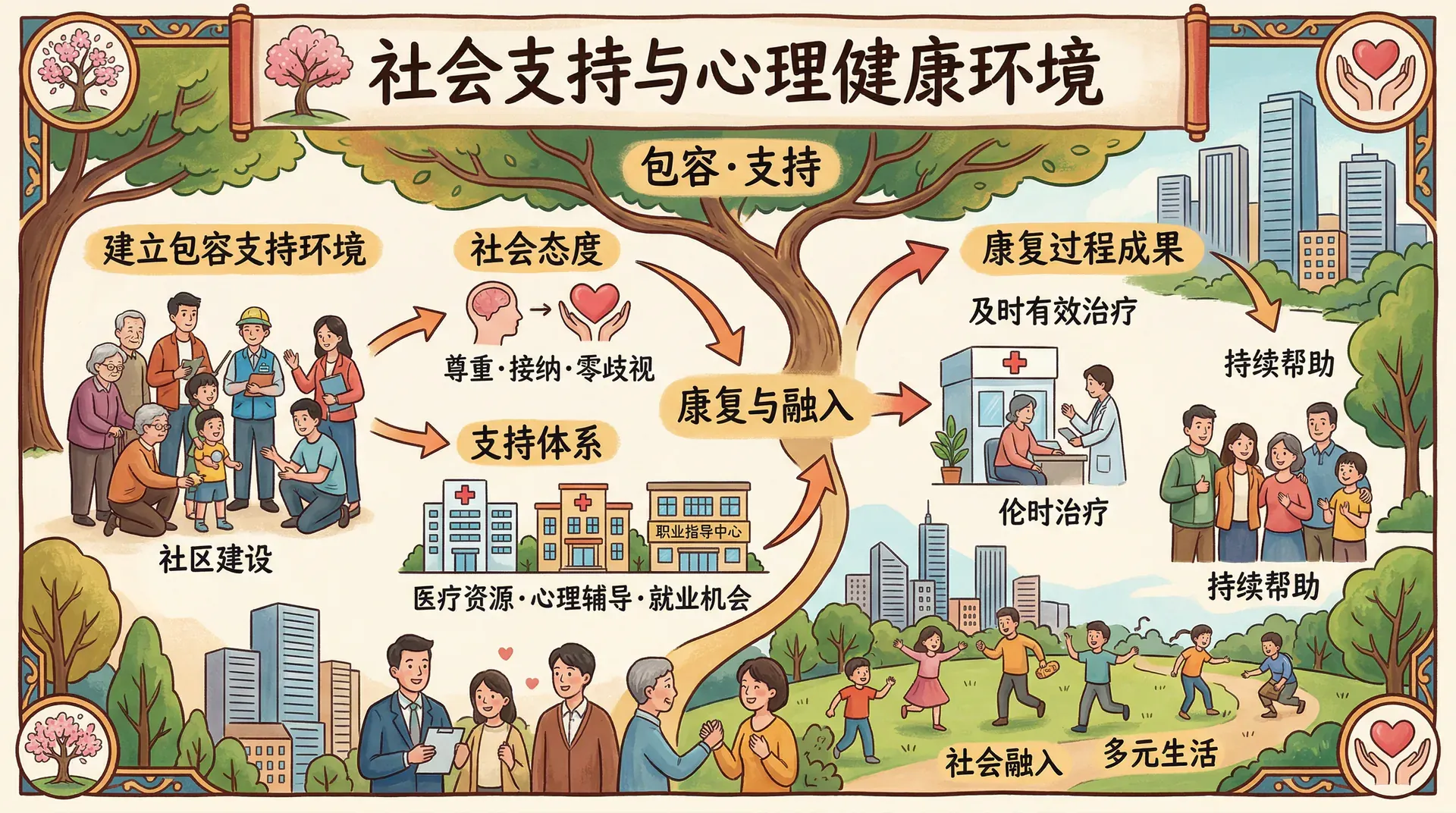 建立一个包容、支持性的社会环境,对于心理障碍患者的康复和社会融入至关重要。社会的整体态度和支持体系往往决定了患者能否获得及时有效的治疗,以及在康复过程中能否得到持续的帮助。