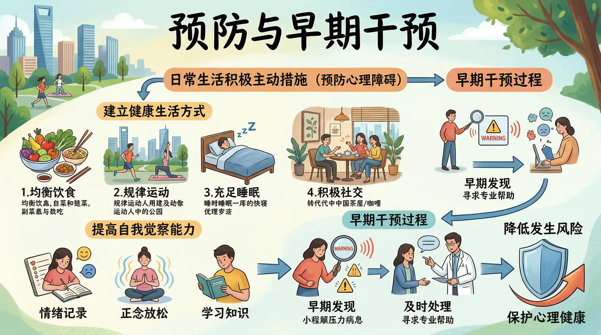 预防心理障碍的发生比治疗本身更具意义。通过在日常生活中采取积极主动的措施,建立健康的生活方式并提高自我觉察能力,可以有效降低心理障碍的发生风险,并在问题出现的早期阶段及时发现和处理。