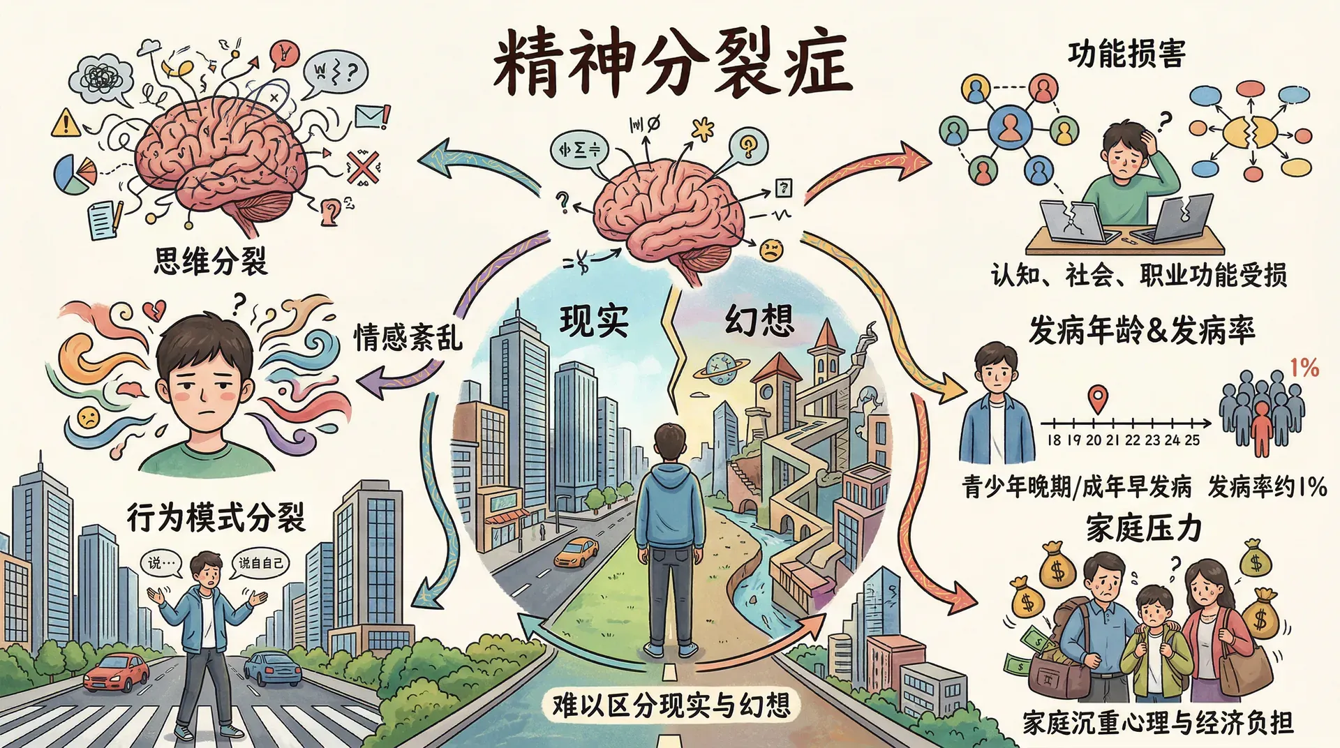精神分裂症是严重的慢性精神障碍,核心特征是思维过程、情感表达和行为模式出现严重的分裂与紊乱,导致患者难以区分现实与幻想的界限。这种疾病通常在青少年晚期或成年早期发病,虽然发病率相对较低,大约在百分之一左右,但对患者个人、家庭和社会造成的影响深远而持久。精神分裂症不仅严重损害患者的认知功能、社会功能和职业能力,还给家庭带来沉重的经济负担和心理压力。