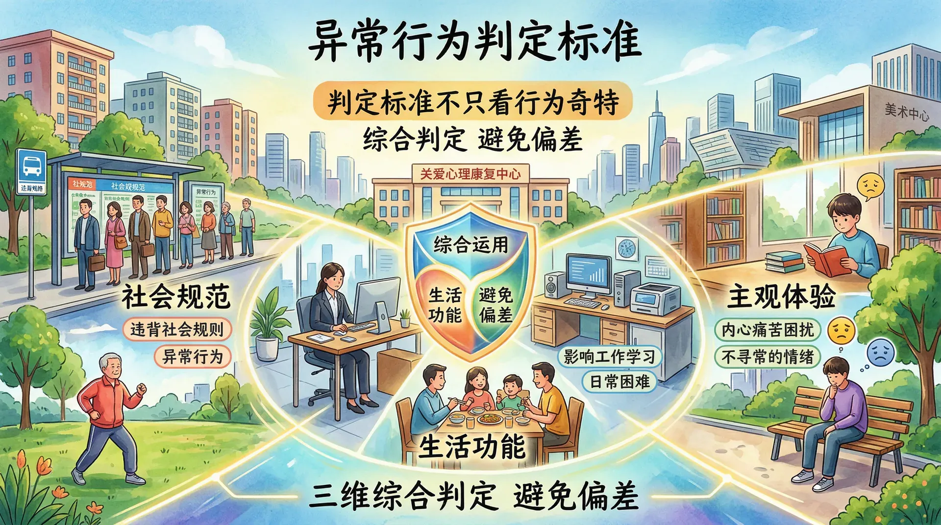 判断一种行为是否构成心理障碍,并非简单依据某人的行为是否看起来奇怪,而是需要综合运用三个相互补充的标准。这三个标准分别从社会规范、生活功能和主观体验三个维度来评估个体的心理健康状况,缺少任何一个维度都可能导致判断偏差。