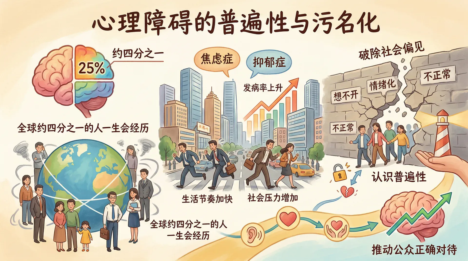 根据世界卫生组织的统计,全球约四分之一的人在一生中会经历某种形式的心理障碍。在中国,随着生活节奏加快和社会压力增加,心理障碍的发病率也在上升,特别是焦虑症和抑郁症已成为影响国人心理健康的主要问题。认识到心理障碍的普遍性,是破除社会偏见、推动公众正确对待心理健康问题的第一步。