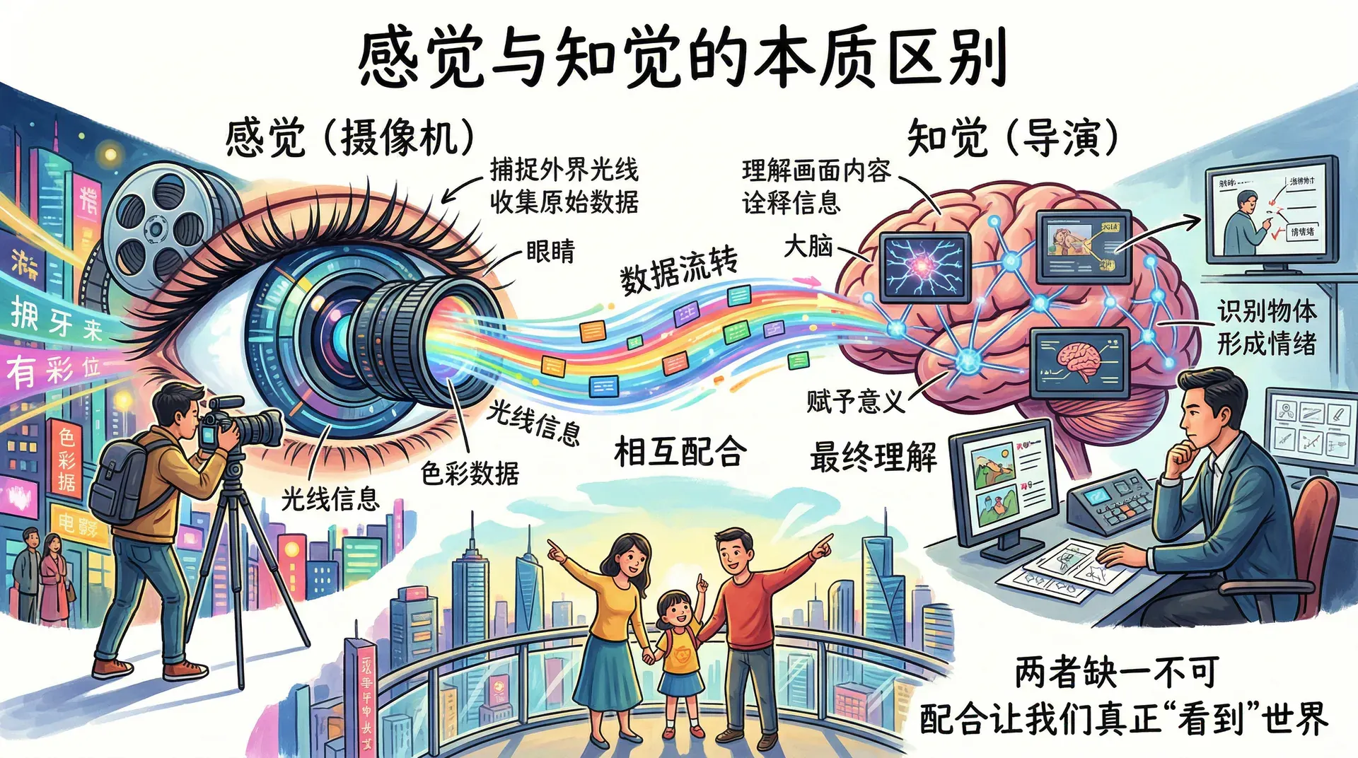 眼睛如同一台精密的摄像机,不断捕捉外界的光线信息。但仅有摄像机还不够,还需要一个“导演”来理解和诠释这些画面。在我们的感知系统中,感觉器官是摄像机,大脑则是导演。两者缺一不可,相互配合,才能让我们真正“看到”这个世界。