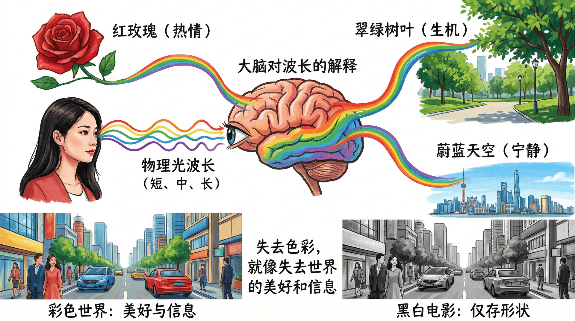 色彩并不是光线本身的属性,而是我们大脑对不同波长光线的心理解释。红玫瑰的热情、翠绿树叶的生机、蔚蓝天空的宁静——这些都不是客观存在的物理特性,而是我们内心创造的主观体验。如果世界失去了色彩,就像老式黑白电影一样,我们虽然仍能看清物体的形状和大小,但会失去多少美好和信息?