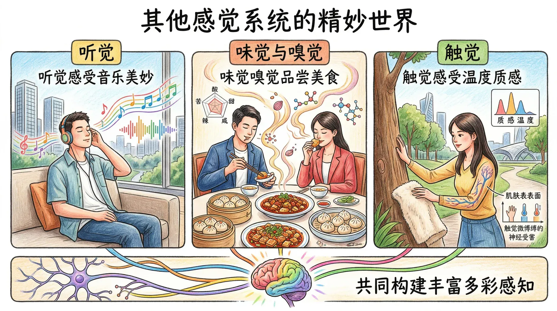 虽然我们分别讨论了各种感觉系统,但在现实生活中,这些系统是协同工作的。除夕夜坐在家里,你看到烟花绽放,听到噼里啪啦的爆竹声,闻到硝烟的气味,感受到冬夜里透窗而入的凉意。这些不同的感觉信息在大脑中被整合成一个统一的体验,构成了对那个夜晚完整而鲜明的记忆。