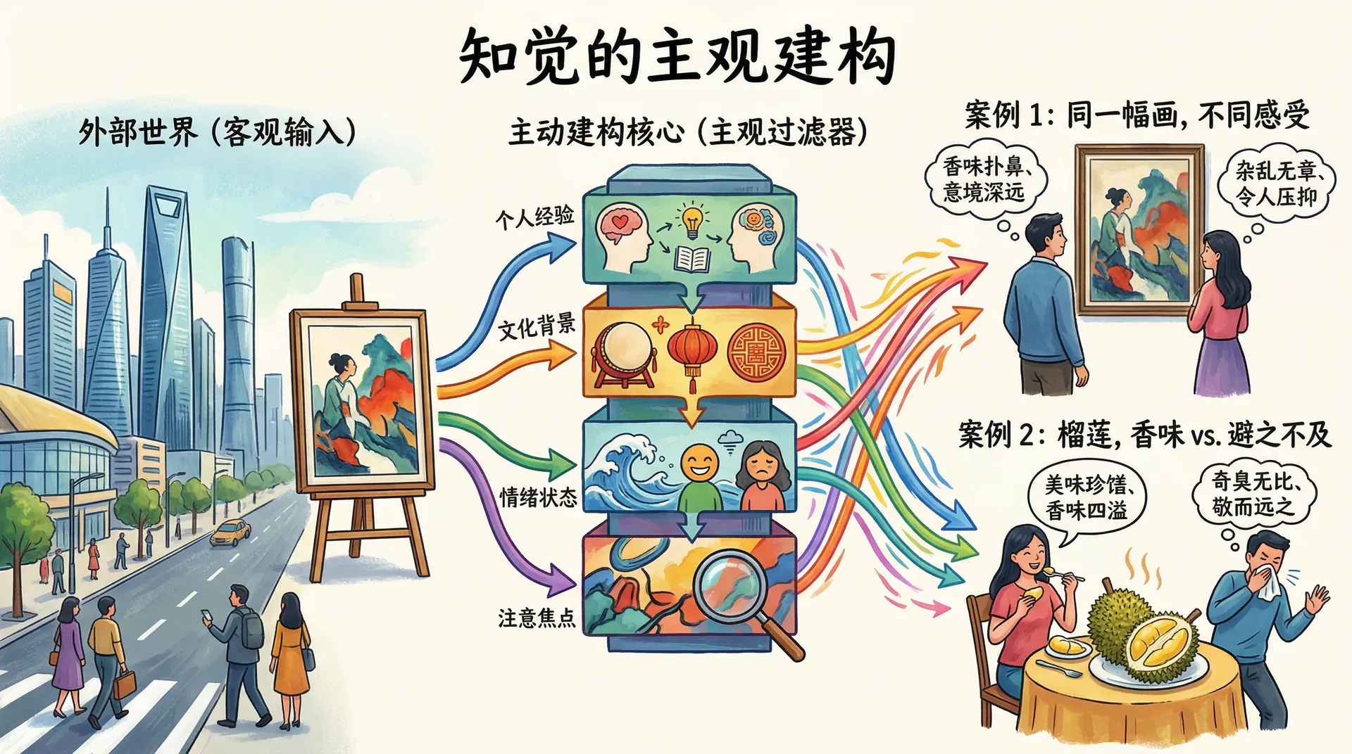 知觉不是对外界世界的被动记录,而是一个主动的建构过程。我们每个人都在根据自己的经验、文化背景、当时的情绪状态和注意焦点来“创造”自己版本的现实世界。这就解释了为什么两个人看同一幅画会有完全不同的感受,为什么有人觉得榴莲香味扑鼻,而另一些人却避之不及。