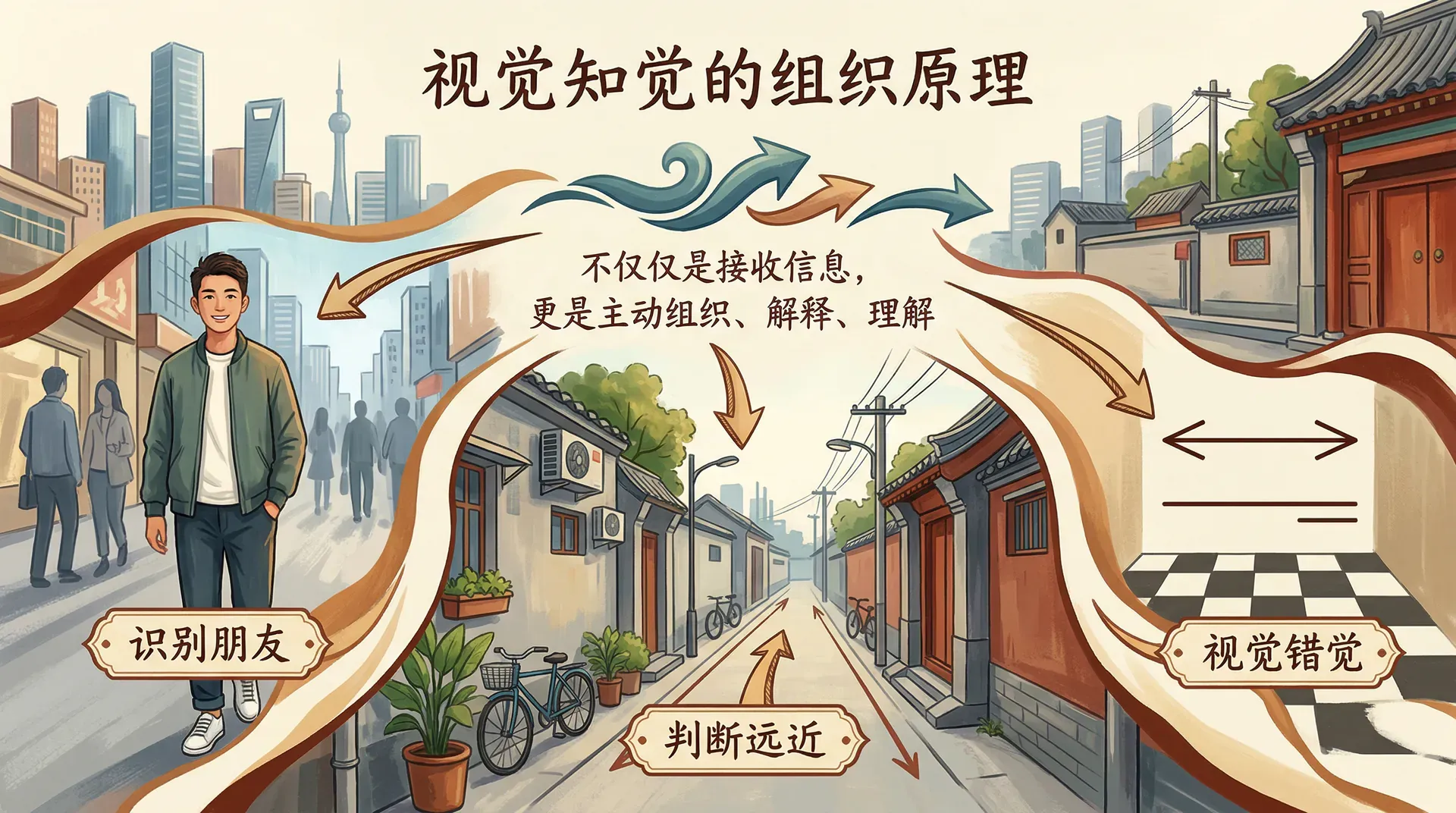 拿到一张照片,你能立刻认出里面是你的朋友,而不会把他当成陌生人。走在北京的胡同里,你能准确判断哪座建筑更远、哪堵墙更近。看到一幅错觉图,你可能会惊讶于同样的线条竟然能让人产生不同的理解。这些日常的视觉体验展现了知觉的神奇之处:它不仅仅是接收信息,更是主动地组织、解释和理解这些信息。