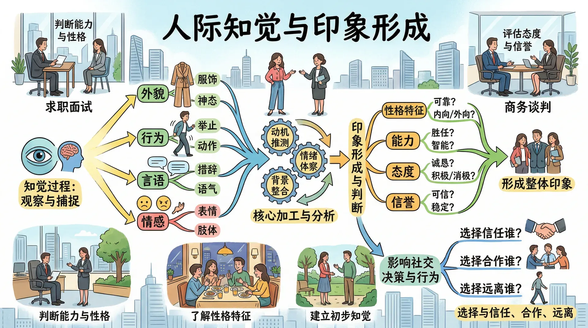 人际知觉指在与他人接触、交流和互动时,对其外貌、行为、言语、情感以及潜在动机等进行观察、分析和解释,从而在内心形成对对方的整体印象。无论是求职面试、商务谈判,还是朋友聚会、与陌生人初识,每一次人际互动都伴随着对对方性格特征、能力、态度和信誉的主观判断。这个过程不仅包括对表面特征的捕捉,还涉及动机推测、情绪体察和背景信息的整合。正是这些知觉和评价,影响着我们选择信任谁、与谁合作、远离谁,也塑造了社交决策和后续行为。