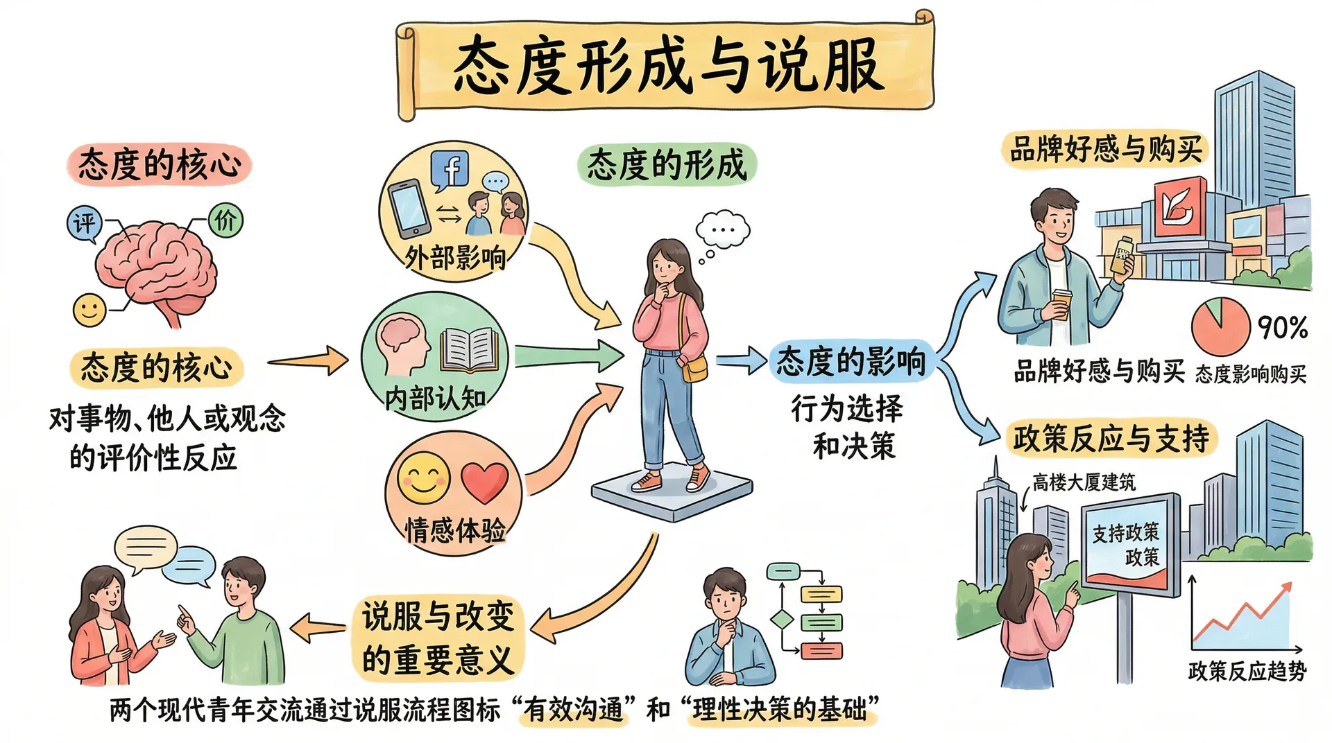 态度是人们对事物、他人或观念的评价性反应,它直接影响行为选择和日常决策。从对某个品牌的好感,到对某项政策的支持或反对,态度无时无刻不在左右我们的判断。理解态度是如何形成的,以及它在什么条件下会发生改变,对于有效沟通和做出理性决策都具有重要意义。