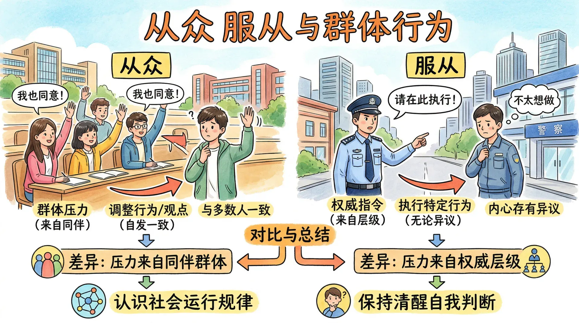 从众和服从是社会心理学中两个核心现象。从众指个体在群体压力下自发调整行为或观点,使之与多数人保持一致;服从则指在权威人物的指令下执行特定行为,即便内心存有异议。两者表面上相似,本质上却有所不同:从众的压力来自同伴群体,服从的压力来自权威层级。理解这两种现象产生的心理机制,不仅有助于我们认识社会运行的规律,也有助于在群体生活和组织决策中保持更清醒的自我判断。