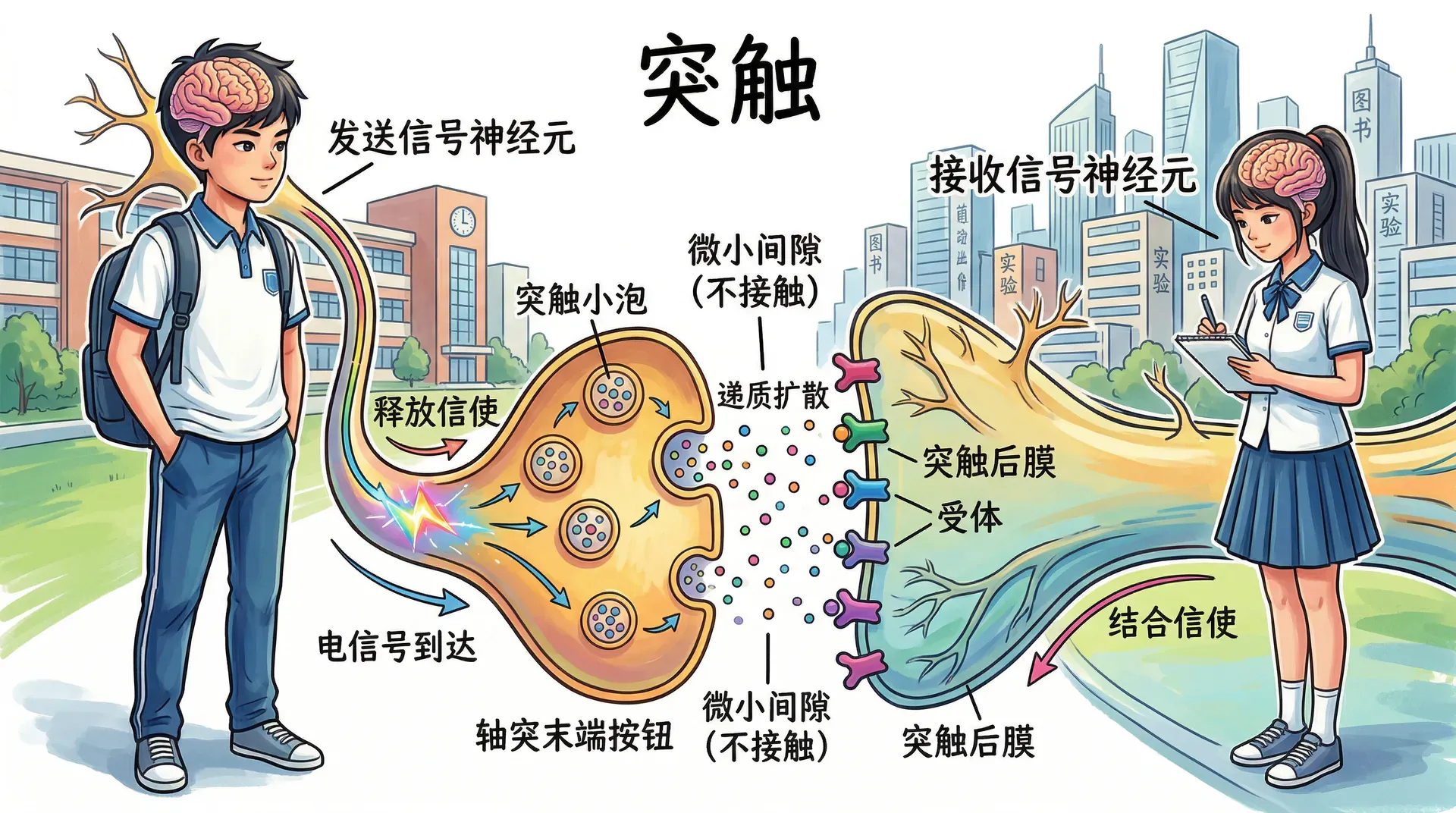 在神经系统中,神经冲动作为信号在神经元之间传递,而这种传递发生在称为突触的特殊连接处,依赖化学信使来完成跨越细胞间隙的信号传导。
