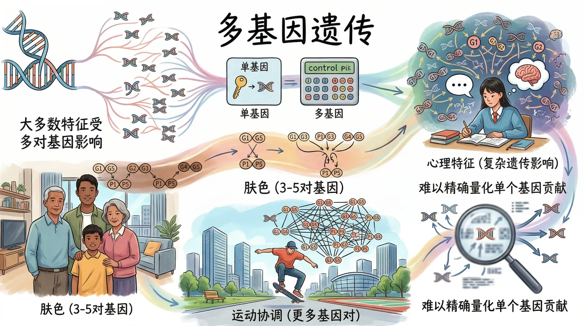 大多数人类特征受不止一对基因的影响,这种遗传模式称为多基因遗传。肤色被认为受三到五对基因的相互作用影响,运动协调等复杂身体能力可能涉及更多基因对之间错综复杂的相互作用。心理特征中凡是表现出遗传影响的,几乎都涉及复杂的多基因遗传模式,这也使得精确量化单个基因对行为的贡献变得极为困难。