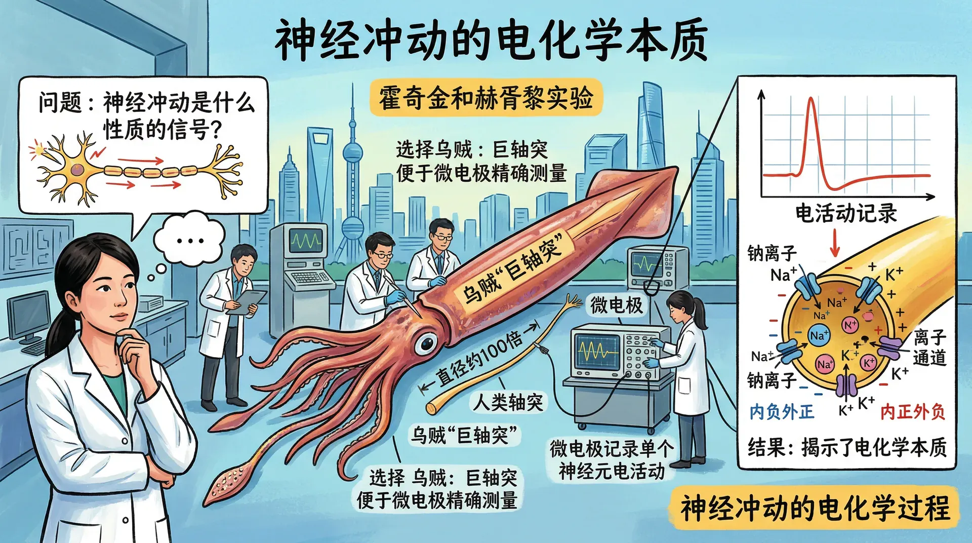 当神经元受到刺激时究竟发生了什么?沿轴突传播的神经冲动,本质上是什么性质的信号?这些问题由霍奇金和赫胥黎在针对乌贼轴突的开创性实验中首先得到解答。他们选择乌贼,是因为乌贼拥有一对直径约为人类轴突百倍的“巨轴突”,更便于放置微电极进行精确测量。通过记录单个神经元的电活动,他们揭示了神经冲动的电化学本质。