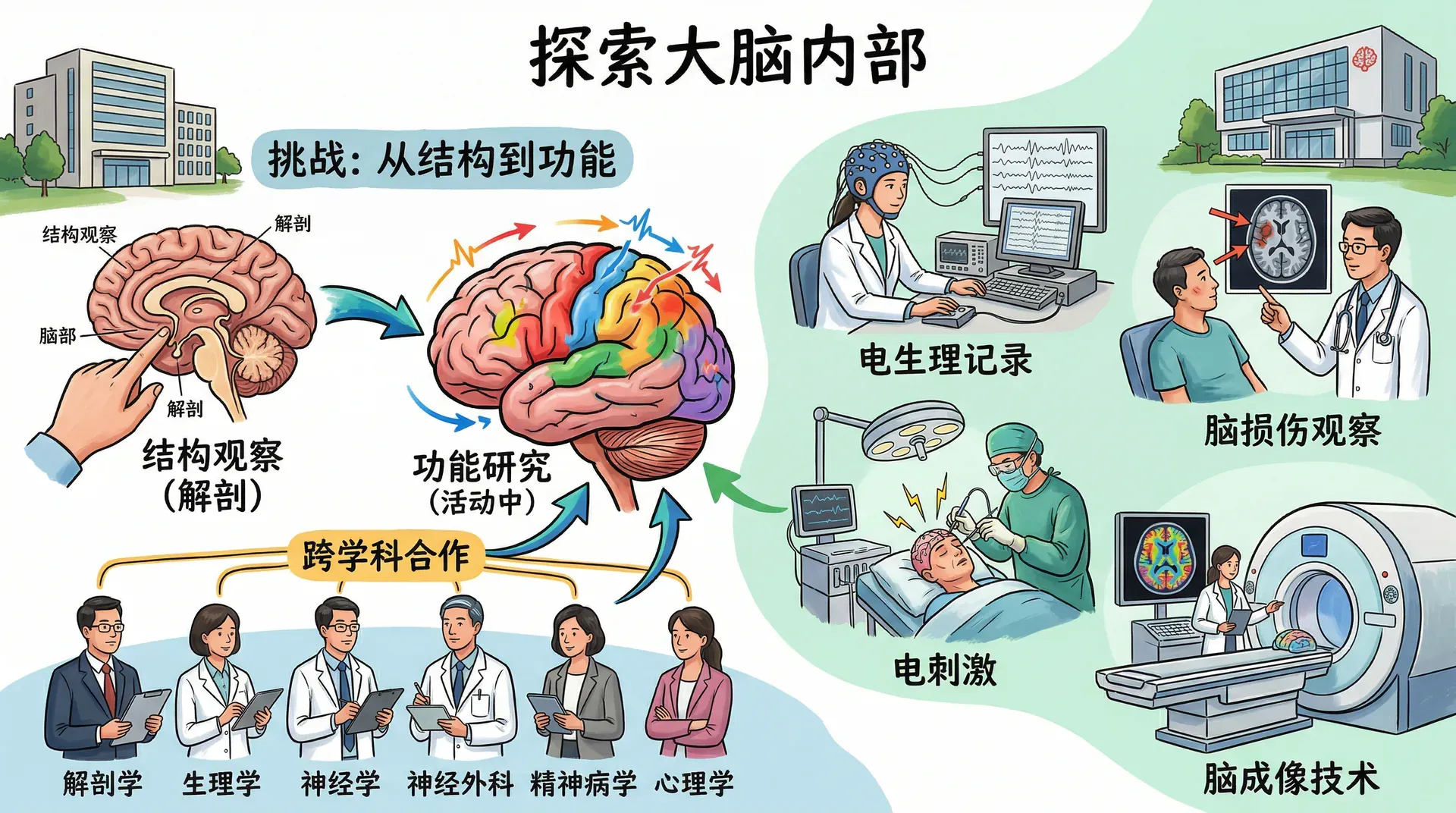 大脑研究通常涉及来自解剖学、生理学、神经学、神经外科、精神病学和心理学等多个学科的神经科学家之间的密切合作,这种跨学科的研究模式极大地推动了人类对大脑与行为关系的认识。