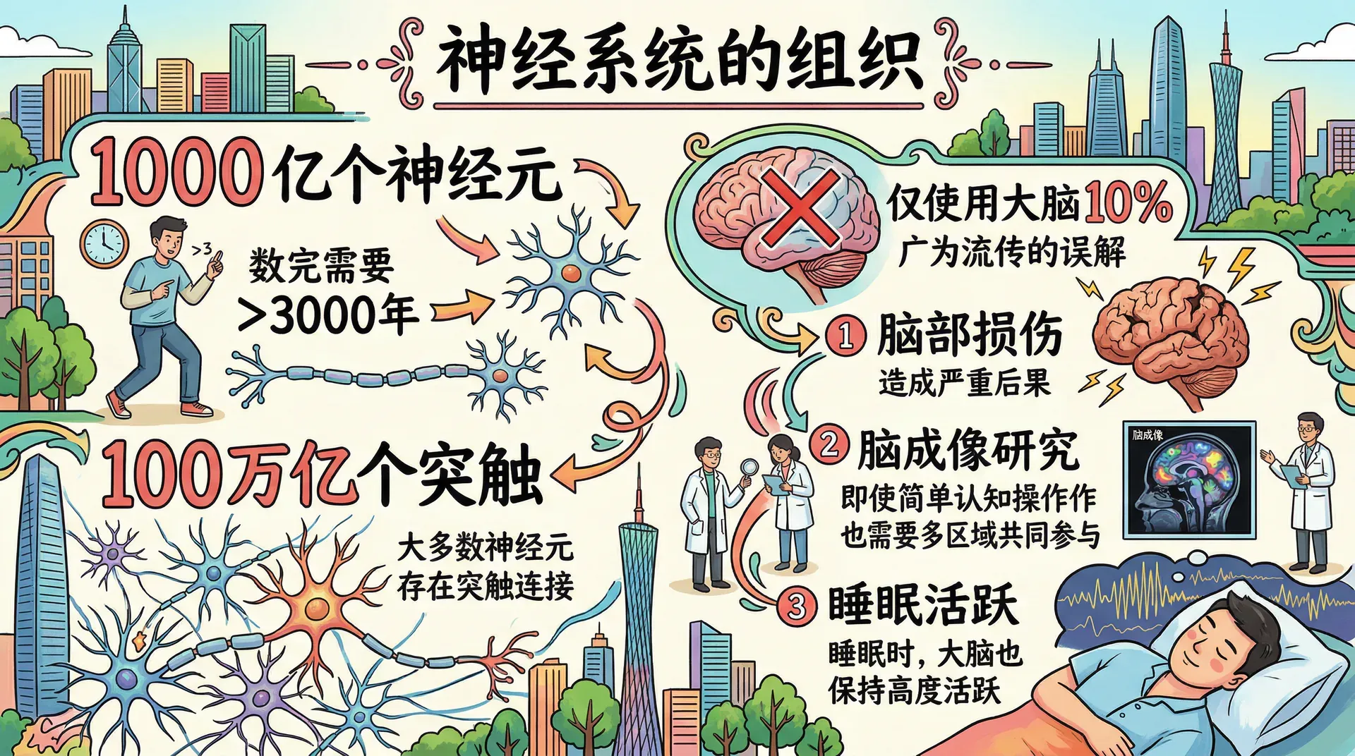 人类大脑中大约有1000亿个神经元,如果以每秒数一个的速度不停计数,需要超过3000年才能数完。而且大多数神经元与许多其他神经元存在突触连接,人脑中的突触总数可能高达100万亿个。如此庞大的数字,催生了“人们只使用了大脑10%”这一广泛流传的说法,但这完全是误解。如果大脑真有90%是冗余的,那么脑部损伤就不会造成如此严重的后果;脑成像研究清楚地表明,即便是简单的认知操作,也需要大脑多个区域共同参与。实际上,即使在睡眠期间,大脑也保持着高度活跃的状态。