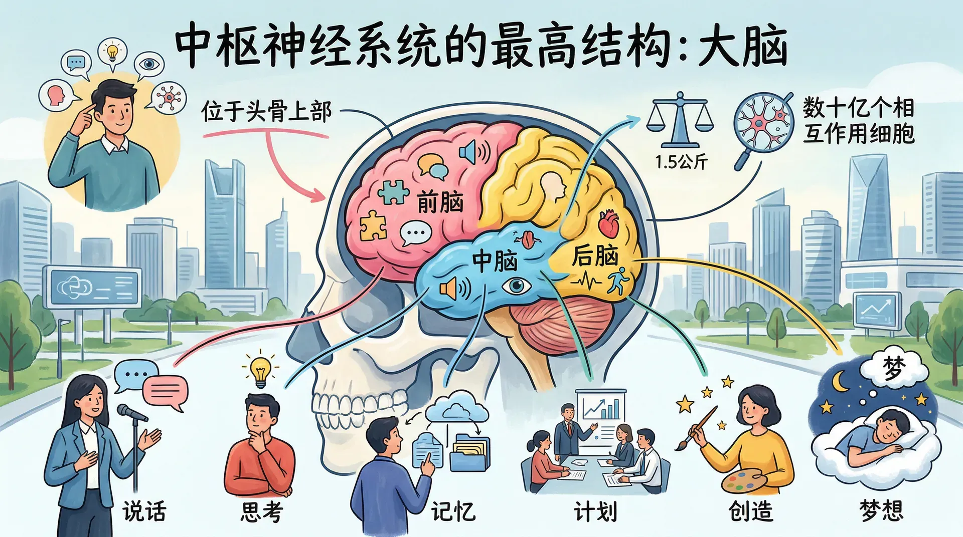 中枢神经系统的最高结构是大脑。从解剖学上讲,大脑是填充头骨上部的中枢神经系统部分。它重约1.5公斤,看似不大,却包含数十亿个相互作用的细胞。这些细胞整合来自身体内外的信息,协调身体的行动,使人类能够说话、思考、记忆、计划、创造和梦想。大脑可以分为三个主要区域:后脑、中脑和前脑。