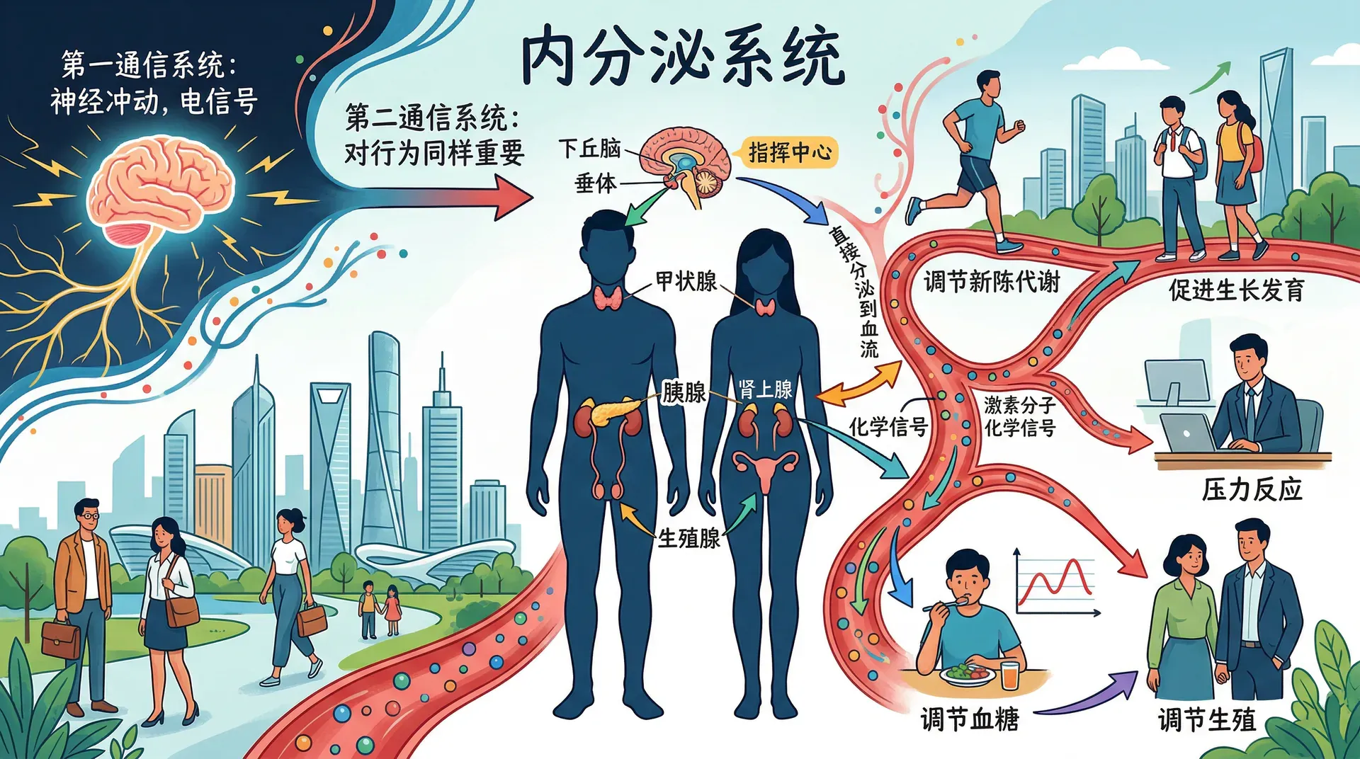 大脑通过神经系统与身体其他部分通信,但身体还拥有第二套对行为同样重要的通信系统:内分泌系统。内分泌系统由一系列腺体组成,这些腺体将化学物质直接分泌到血流中,调控各种身体功能,其信使分子称为激素。