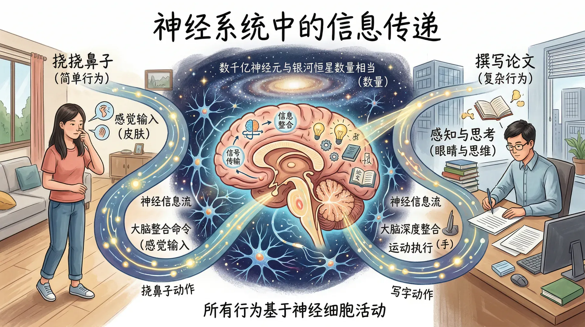 当一名学生在备考期间观看悬疑剧时,紧张的情节让手心出汗、心跳加速。表面上只是在“看电视”,体内却正进行着极其复杂的神经活动:屏幕光线刺激眼睛,大脑瞬间解释视觉信息,神经信号快速传遍全身,触发一系列生理反应。这个日常场景揭示了行为对快速信息处理的依赖——信息从眼睛传到大脑,从大脑传到肌肉,又从手掌传回大脑。神经系统本质上是一个复杂的通信网络,信号在其中不断地被传输、接收和整合。