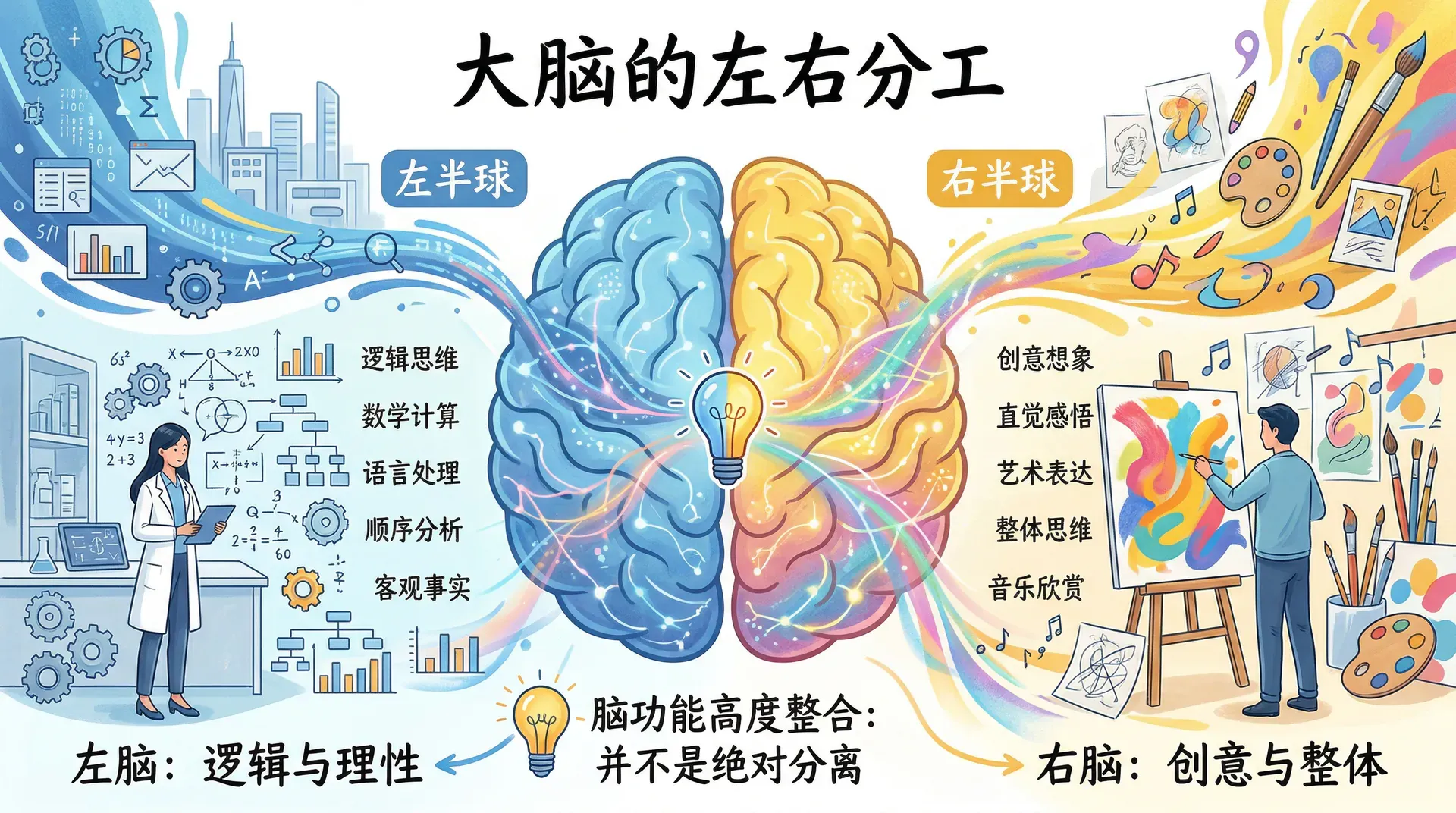 大脑两个半球的功能专门化是真实存在的,但远比通俗说法描述的要复杂。“左脑理性,右脑感性”的说法将复杂的大脑功能过度简化,现实中两个半球始终是协同工作的整体。