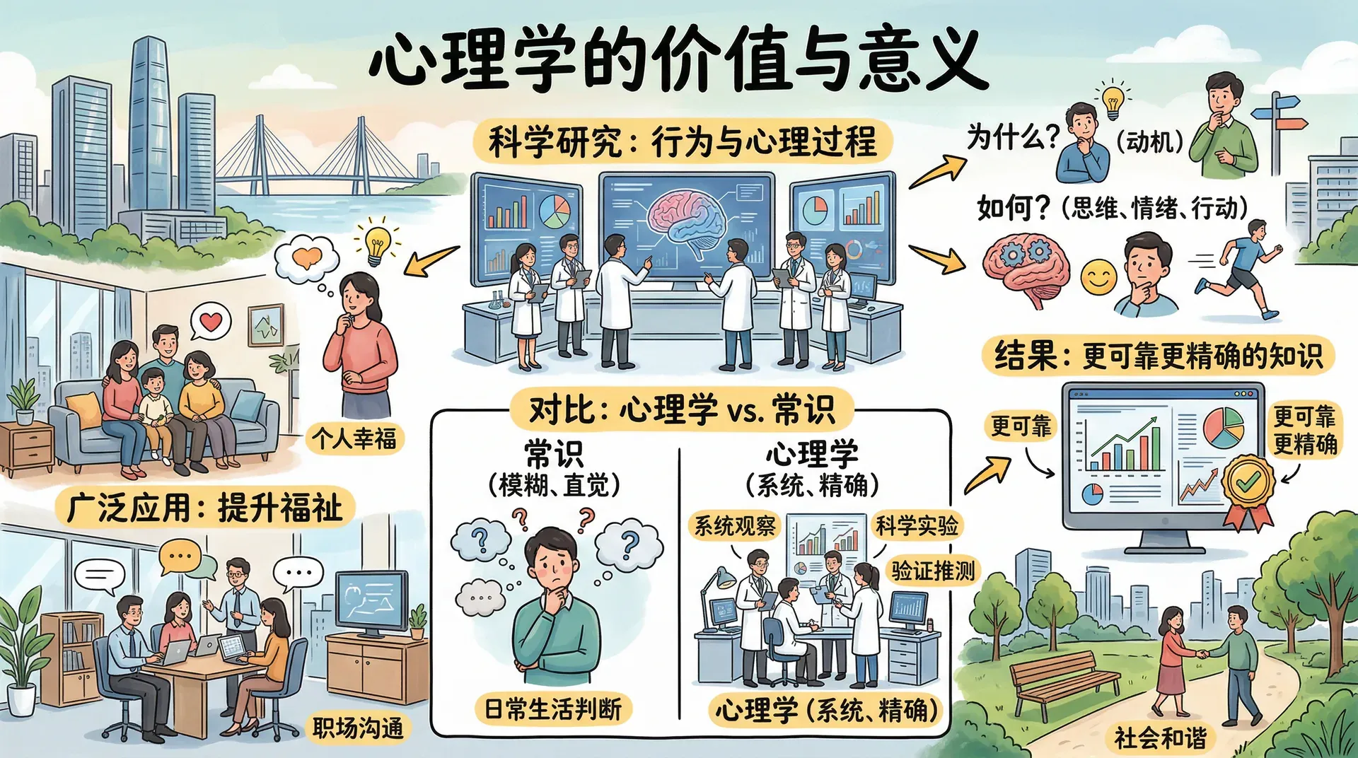 心理学是一门研究人类行为与心理过程的科学。它既关注人为什么会做某件事,也关注人是如何思考、感受和行动的。与日常的直觉判断不同,心理学依靠系统的观察和实验来验证关于行为的推测,因此它提供的知识比“常识”更可靠,也更精确。