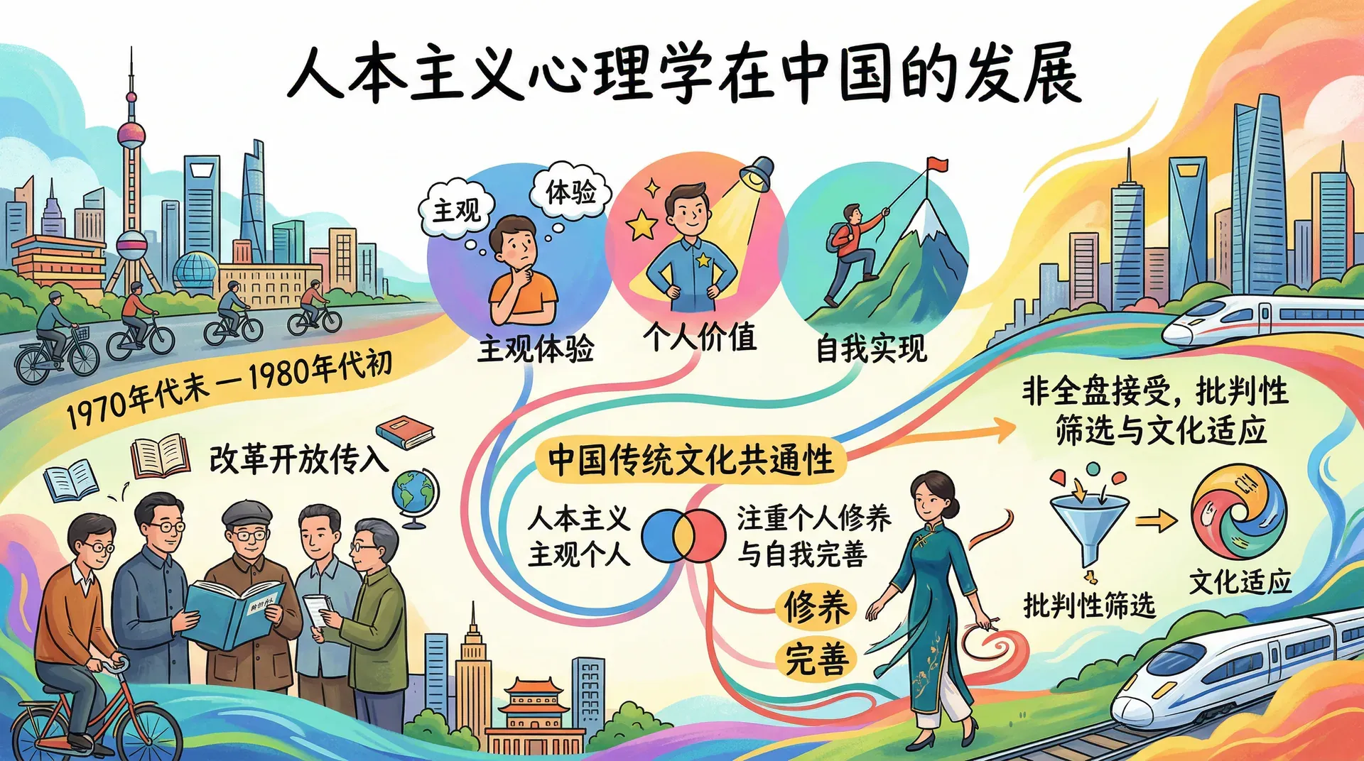 1970年代末和1980年代初,随着改革开放的实施,中国心理学界开始接触人本主义心理学。这一理论强调人的主观体验、个人价值和自我实现,与中国传统文化中注重个人修养和自我完善的思想有一定共通之处。然而,中国学者对它的接受并非全盘照收,而是经历了一个批判性筛选和文化适应的过程。