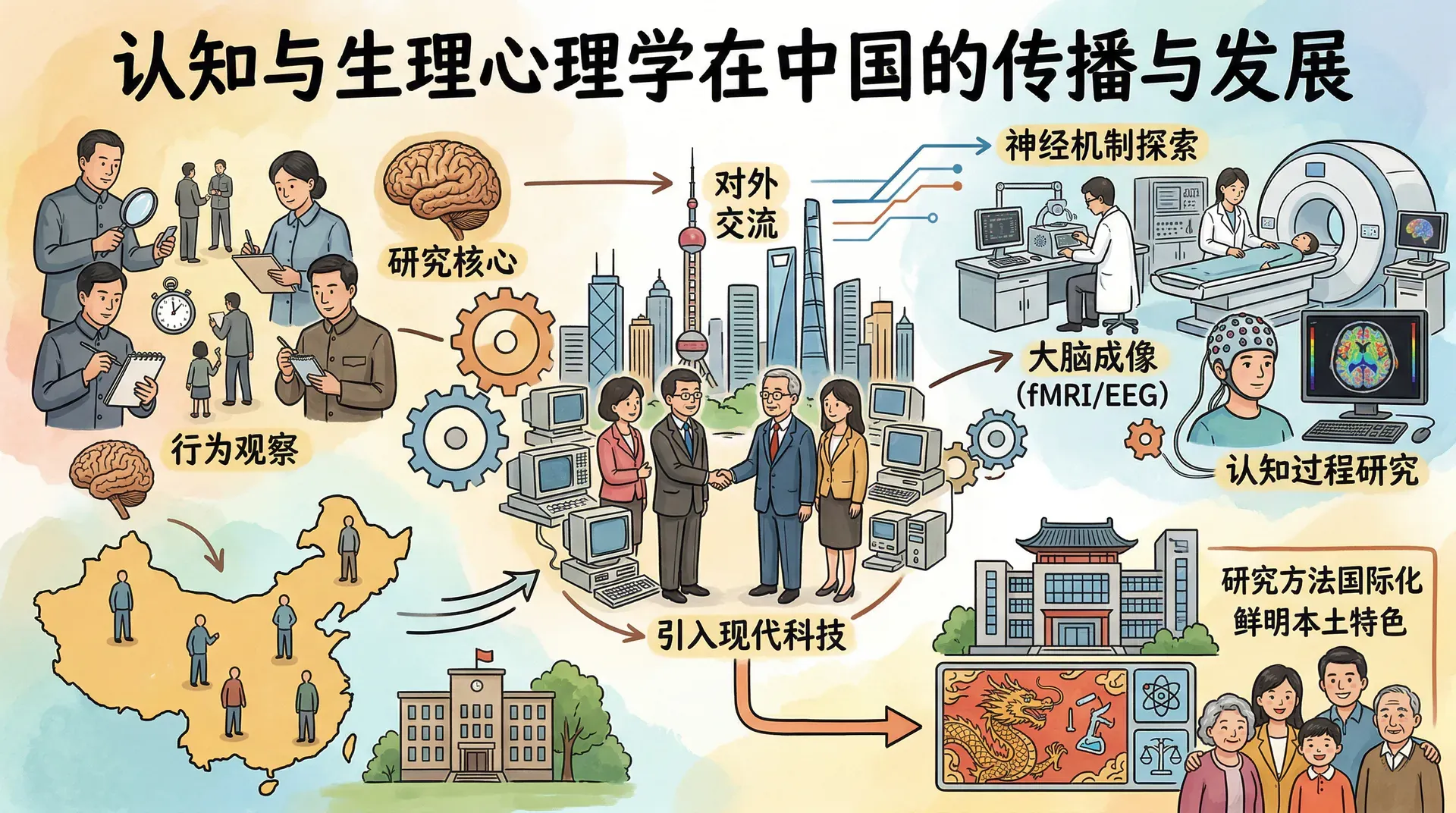 1980年代改革开放后,随着对外交流增加和现代科学技术引入,中国心理学家开始关注认知过程和大脑机制研究,实现了从行为观察向深层心理机制探索的重要转变。这一阶段的发展,使中国心理学在研究方法上与国际接轨,在研究内容上则保留了鲜明的本土特色。