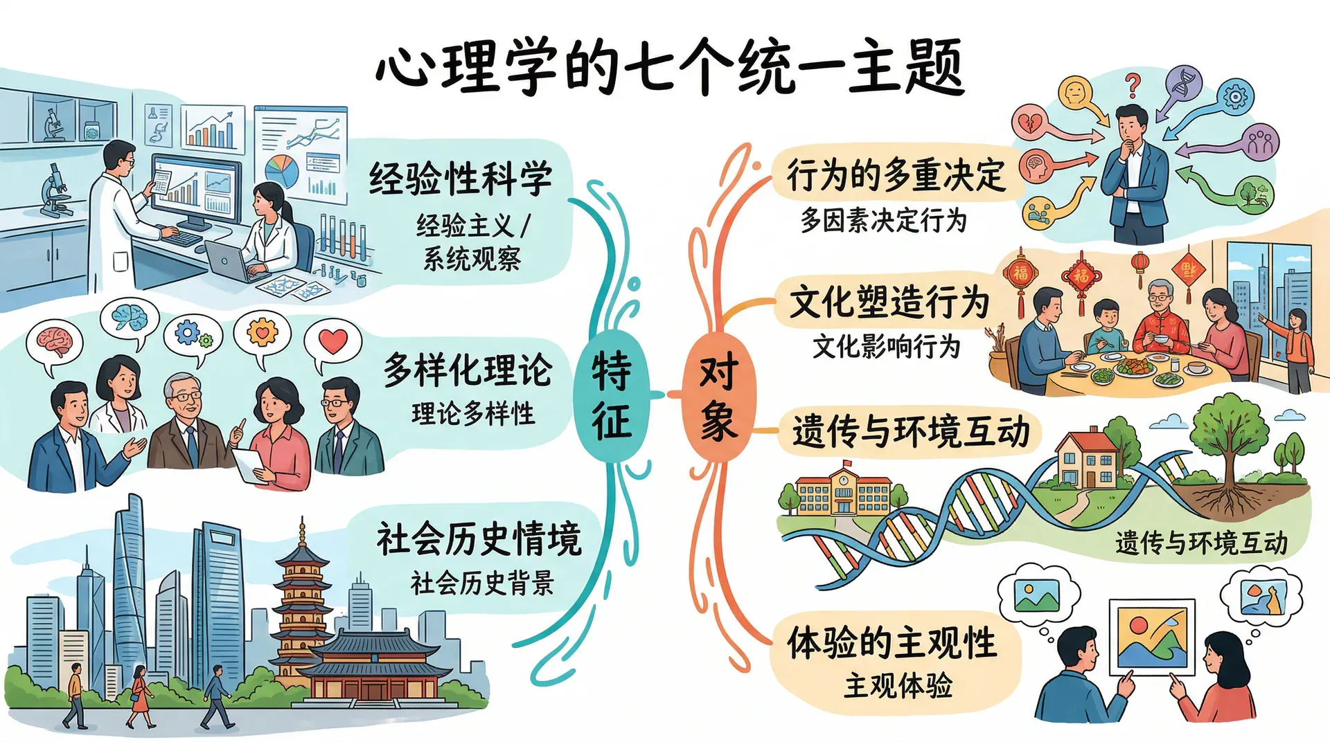 第六个主题,遗传和环境共同影响行为。个体的性格、能力和行为模式,究竟来自天生的遗传继承,还是来自后天的成长环境?这个先天与后天的问题自古以来就被提出。历史上,这一问题常被框架为全有或全无的命题。今天,大多数心理学家同意遗传和环境都很重要。一个世纪的研究表明,两者共同影响个体的智力、气质、人格以及对许多心理障碍的易感性,如果非要选择一个答案,心理学的回答是“两者都是”。