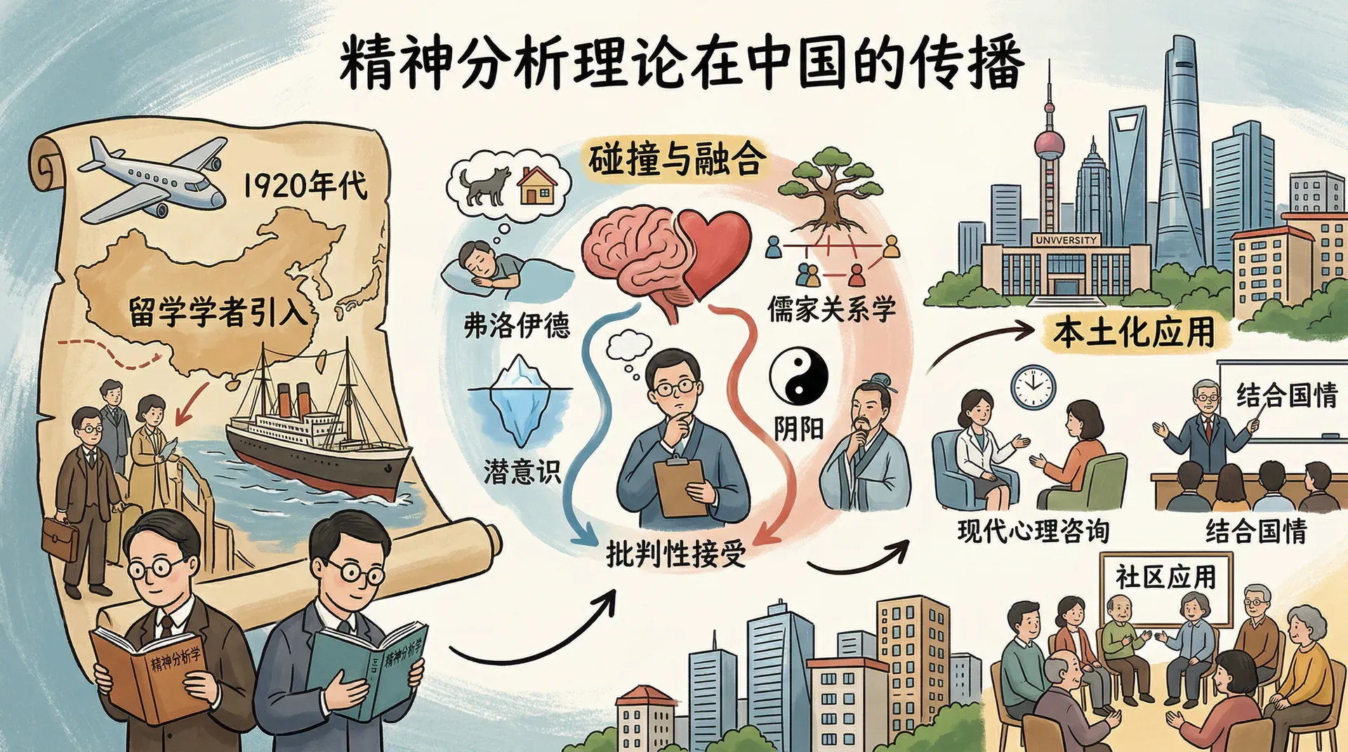 精神分析理论于1920年代传入中国,主要通过留学归国的学者引入。中国学者对这一理论既有接受,也有批判,逐渐形成了具有中国特色的理解和应用方式。这一理论在中国的传播历程,折射出中西文化碰撞与融合的复杂过程。