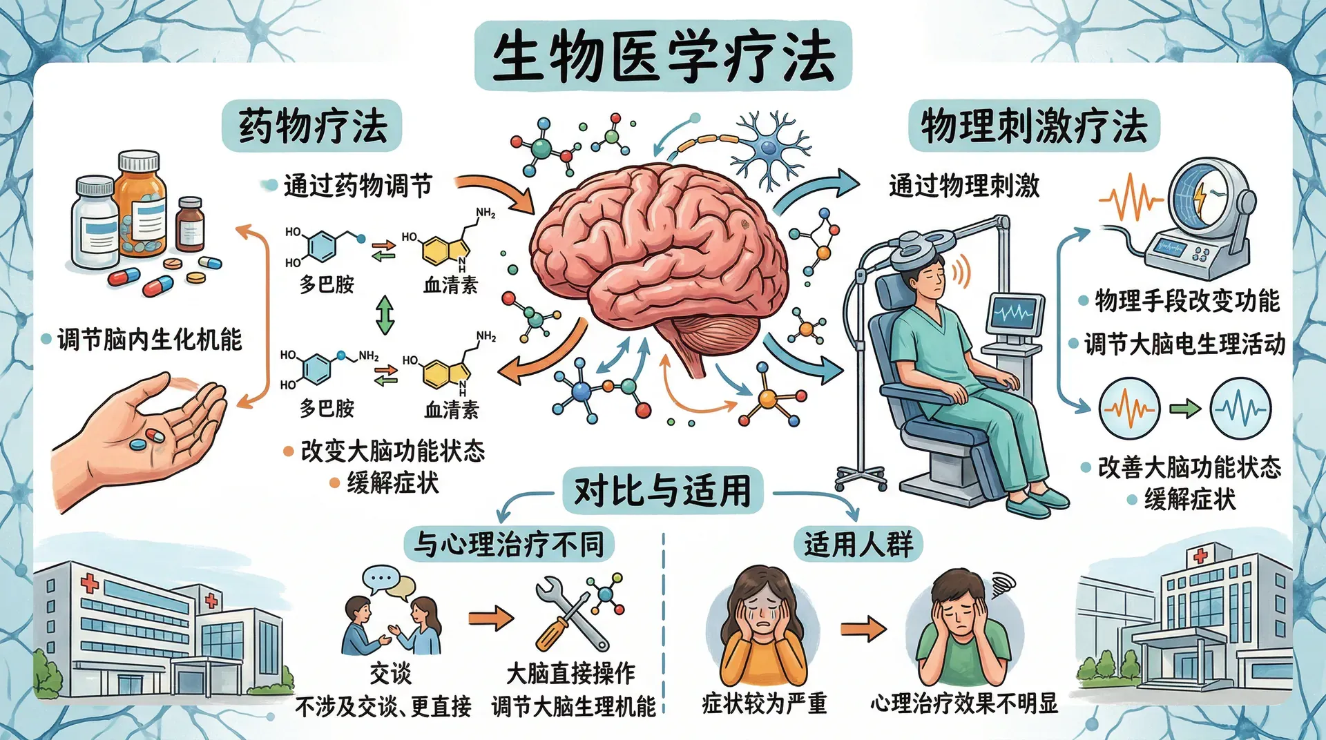 生物医学疗法通过调节身体的生理机能来治疗心理问题。与心理治疗不同,生物医学疗法更直接地从大脑的生化层面入手,通过药物、物理刺激等手段来改变大脑的功能状态。它特别适合那些症状较为严重、或者心理治疗效果不明显的患者。在实际治疗中,生物医学疗法往往与心理治疗结合使用,两者相辅相成,共同发挥更大的疗效。