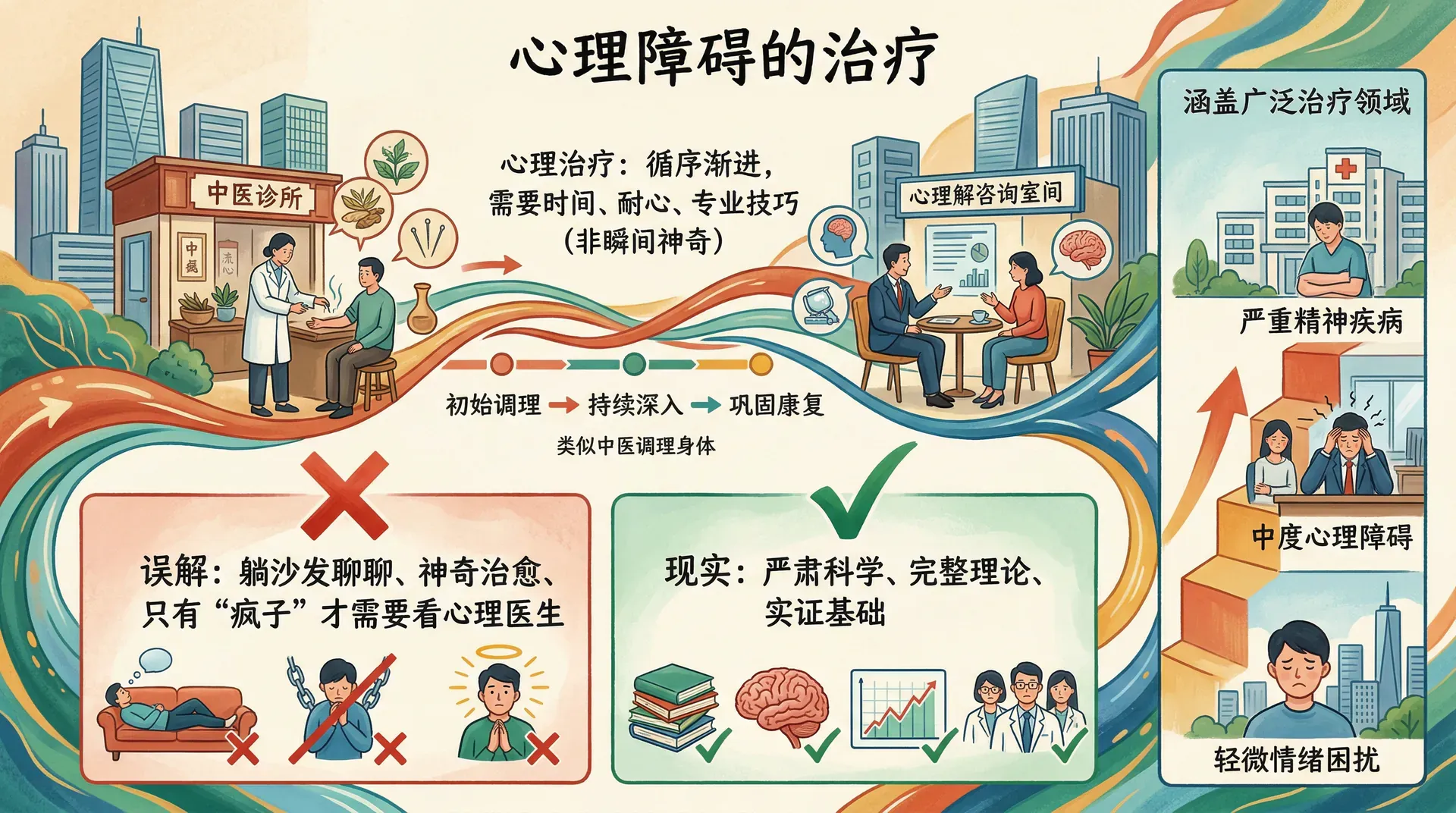 心理治疗并非影视作品中描绘的那样神奇。真正的心理治疗需要时间、耐心和专业技巧,就像中医调理身体一样,是一个循序渐进的过程。很多人对心理治疗存在误解,认为躺在沙发上聊几次天就能解决所有问题,或者认为只有“疯子”才需要看心理医生。事实上,心理治疗是一门严肃的科学,它有着完整的理论体系和实证基础,涵盖了从轻微的情绪困扰到严重的精神疾病的广泛治疗领域。