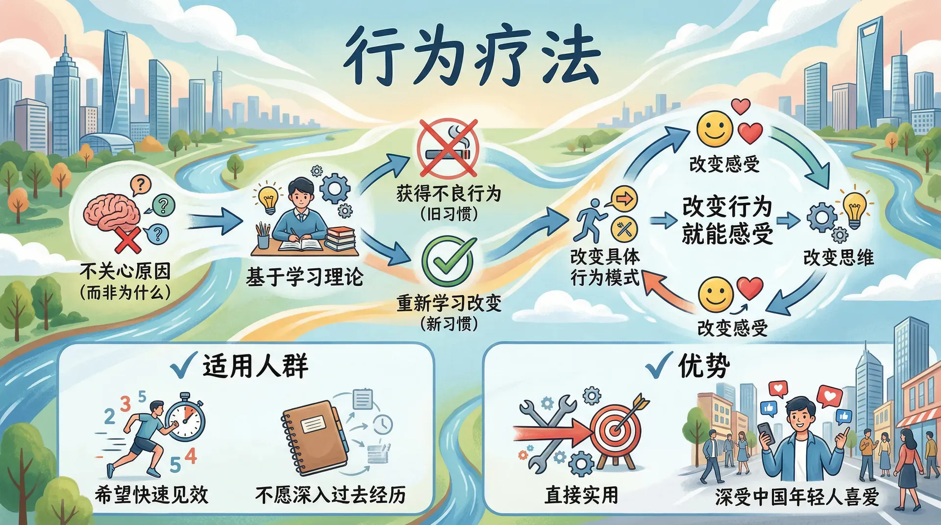 认知行为疗法特别适合治疗抑郁症和焦虑症,在中国特别受欢迎,因为它强调理性思维和自我管理,符合重视教育和自我提升的文化传统。