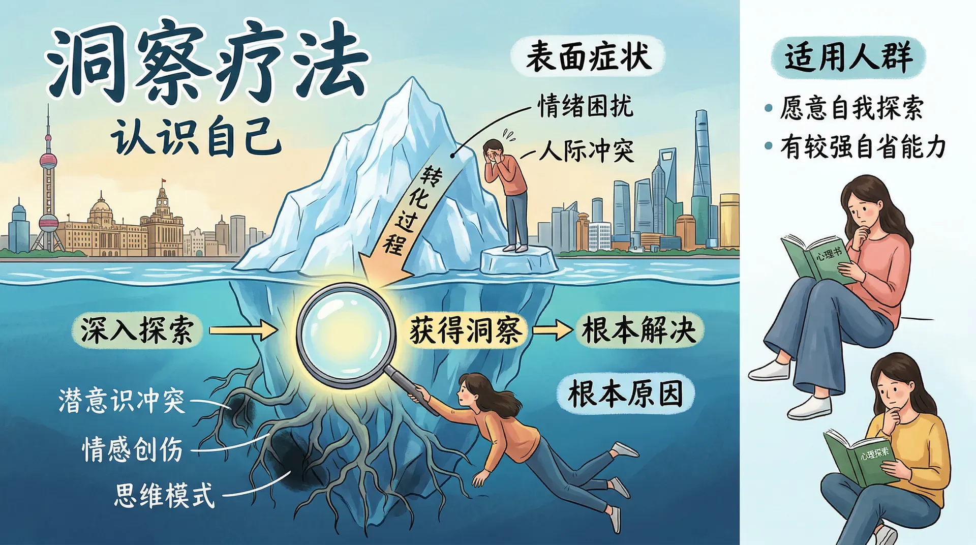 洞察疗法认为表面症状只是深层问题的表现,真正的治疗需要找到根本原因。这种方法相信,很多心理问题都源于潜意识中的冲突、未解决的情感创伤,或者不健康的思维模式。通过深入的探索和理解,患者能够获得洞察,从而从根本上解决问题。洞察疗法的核心理念是“认识自己”,只有真正了解自己的内心世界,才能找到问题的根源并做出改变。这种疗法特别适合那些愿意深入探索自己、有较强自省能力的人。