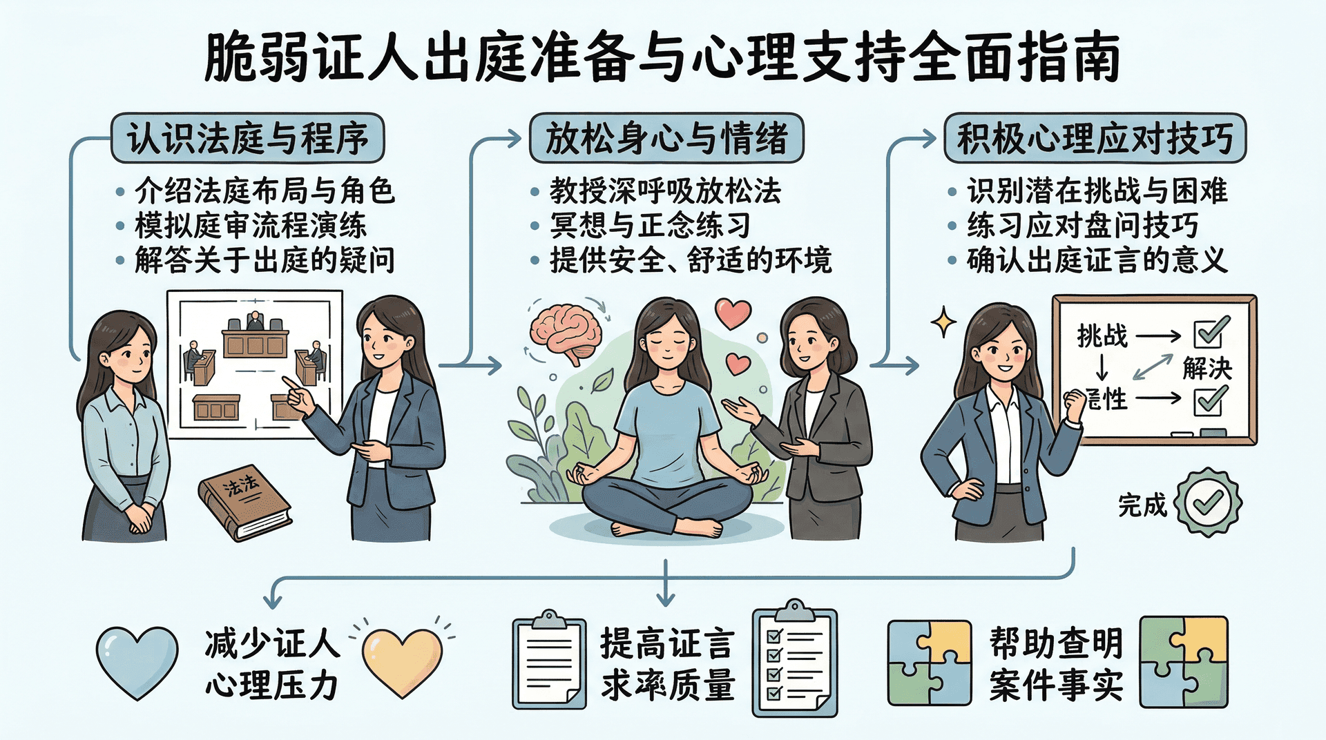 既然脆弱证人在出庭作证过程中面临如此多的困难和恐惧,那么在出庭之前,就应给予充分的准备和支持,帮助他们了解法庭程序、缓解紧张情绪、建立心理预期。这不仅能减少证人的心理压力,还能提高证言的质量,帮助法庭更好地查明案件事实。