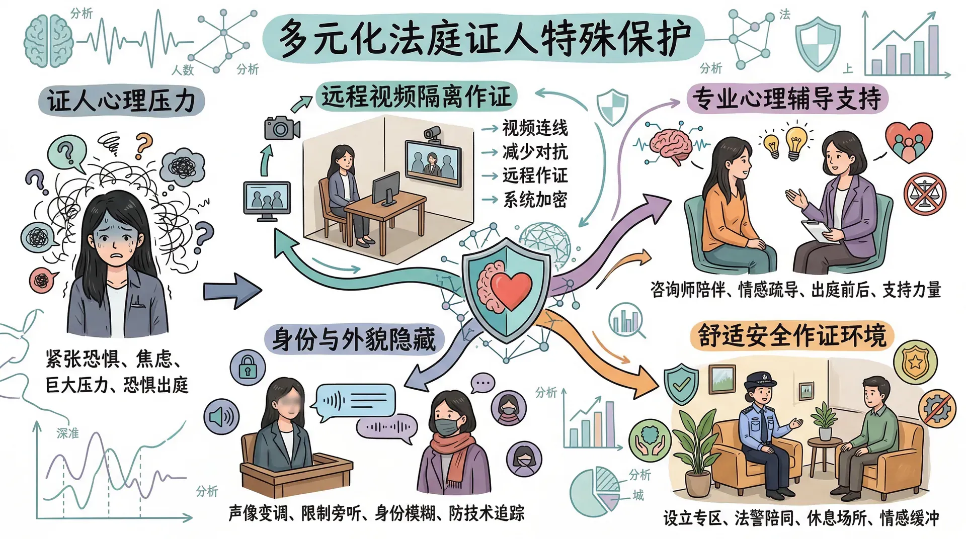 远程视频作证。证人可以在法庭外的专门房间通过视频连线作证,避免与被告人直接对视。这一措施可以大大减轻证人的心理压力,特别适用于未成年人证人和性侵害案件的被害人。