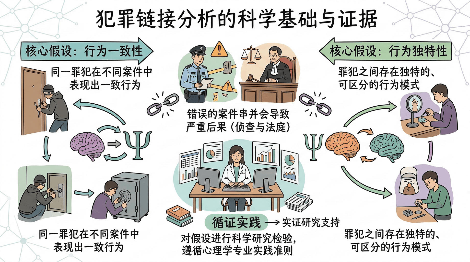 犯罪链接分析应当建立在坚实的科学研究基础之上。无论是在侦查阶段还是在法庭上,错误的案件串并都可能导致严重后果。心理学的专业实践准则强调循证实践的重要性,因此犯罪链接分析所依赖的两个核心假设——行为一致性和行为独特性——必须得到实证研究的支持。