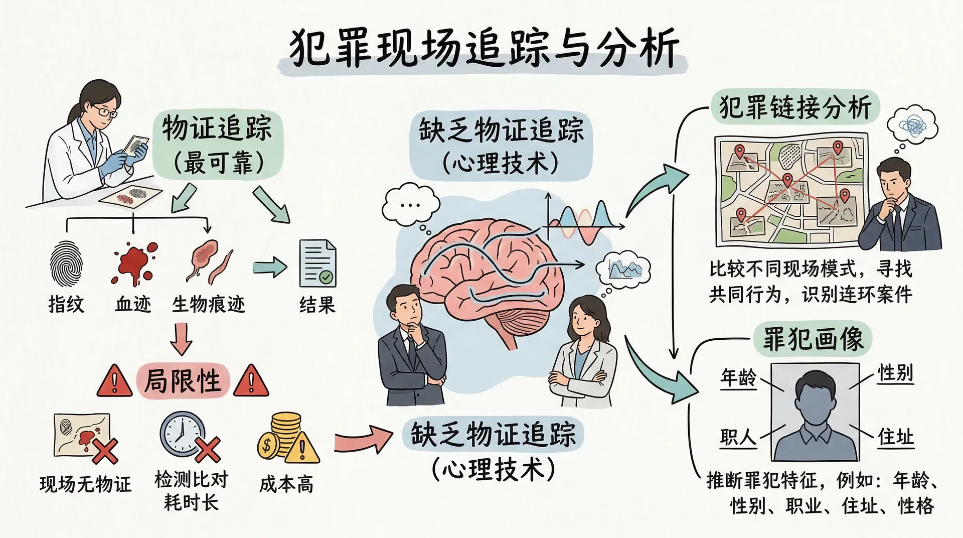 当犯罪现场留有指纹、血迹或其他生物痕迹时,通过物证追踪犯罪分子是最可靠的方法。然而现实中,许多案件现场并未留下可用物证,即便有物证,检测和比对也需要较长时间和不菲成本。在缺乏物证的情况下,侦查人员还能从犯罪现场获取哪些信息来识别和追踪犯罪分子?这就引出了两个重要的心理学技术——犯罪链接分析和罪犯画像。