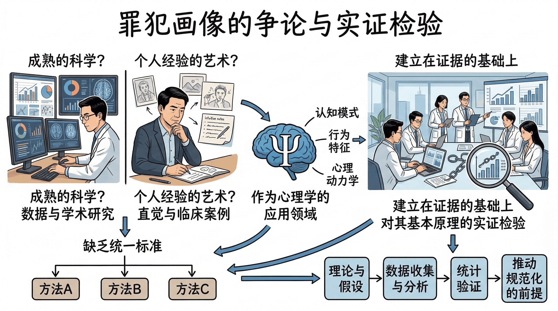 三大流派在知识来源和分析方法上各有侧重,但它们在推断逻辑上存在共同的局限:都在不同程度上依赖实践者个人的经验判断,缺乏统一的质量标准。有学者主张,罪犯画像的发展应当融合各家之长,既重视大型数据库的统计分析,也不忽视重要个案研究的经验价值。这种趋势在近年来正逐渐成为现实,三大流派之间的边界正在变得模糊,一种更为务实的、跨学科的综合性工作模式正在形成。