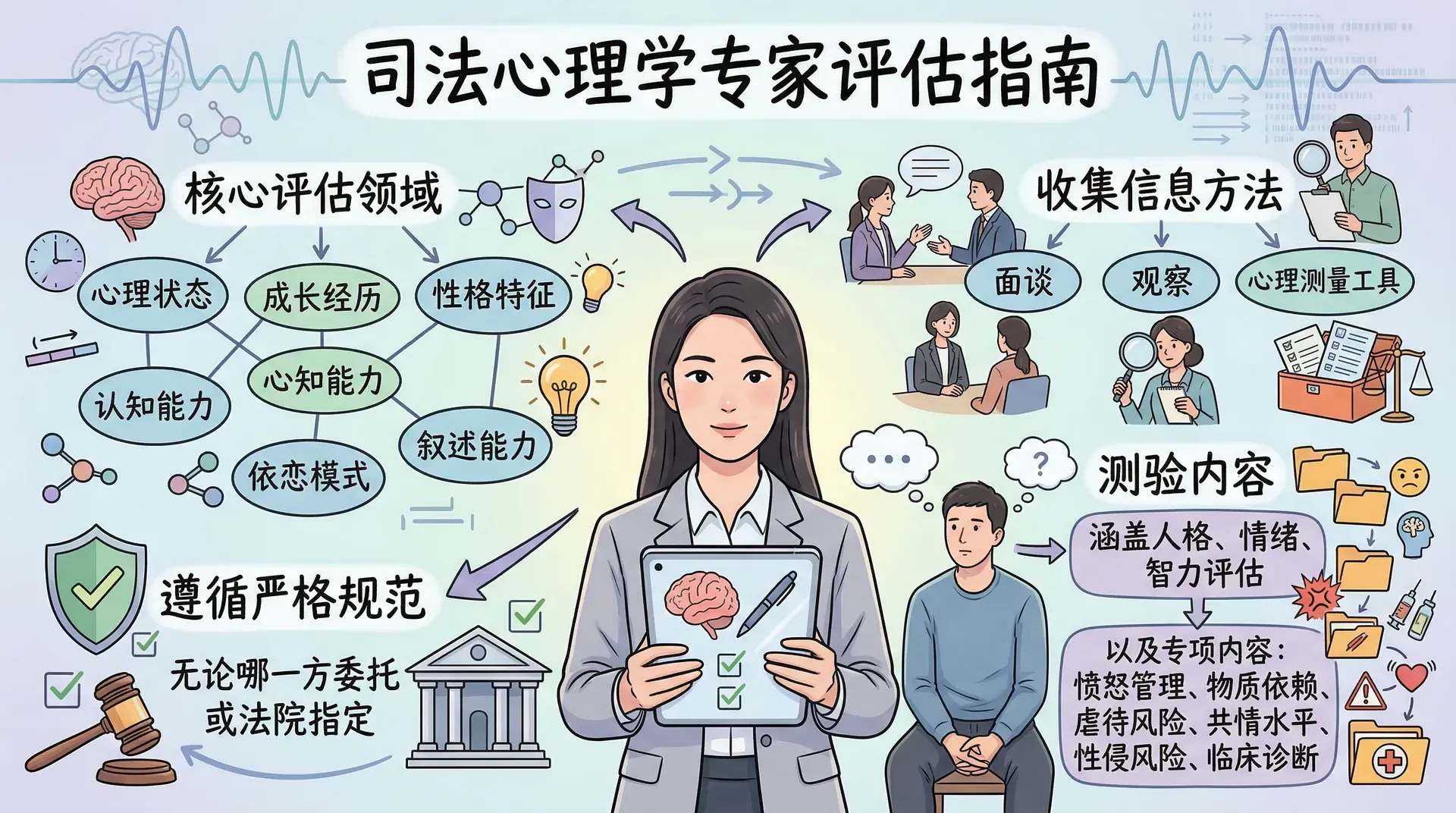 司法心理学实务中,专家证人需要对当事人的心理状态、成长经历、性格特征、认知能力、依恋模式及叙述能力进行专业评估。无论由哪一方委托或由法院指定,这类评估工作都需遵循严格规范。专家通过面谈、观察和心理测量工具收集信息,测验内容根据案情需要而定,涵盖人格、情绪、智力评估,以及愤怒管理、物质依赖、虐待风险、共情水平、性侵风险或临床诊断等专项内容。