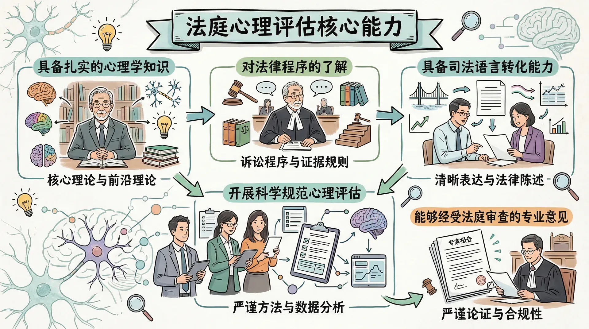 法庭心理学专家的核心工作是开展科学、规范的心理评估,并在此基础上形成能够经受法庭审查的专业意见。这要求专家不仅具备扎实的心理学知识,还需对法律程序有足够的了解,并掌握将专业判断转化为司法语言的能力。