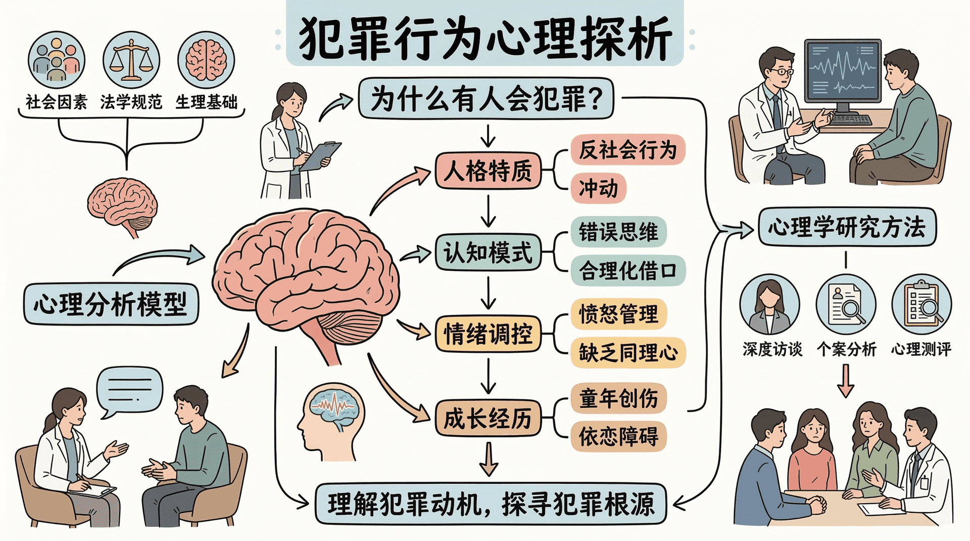 心理学为理解犯罪现象和犯罪动机提供了重要的理论框架。犯罪行为虽然涉及社会学、哲学、医学、生物科学和法学等多个学科领域,但心理学独特的理论体系和研究方法,在回答“为什么有人会犯罪”这一核心问题上有着不可替代的价值。