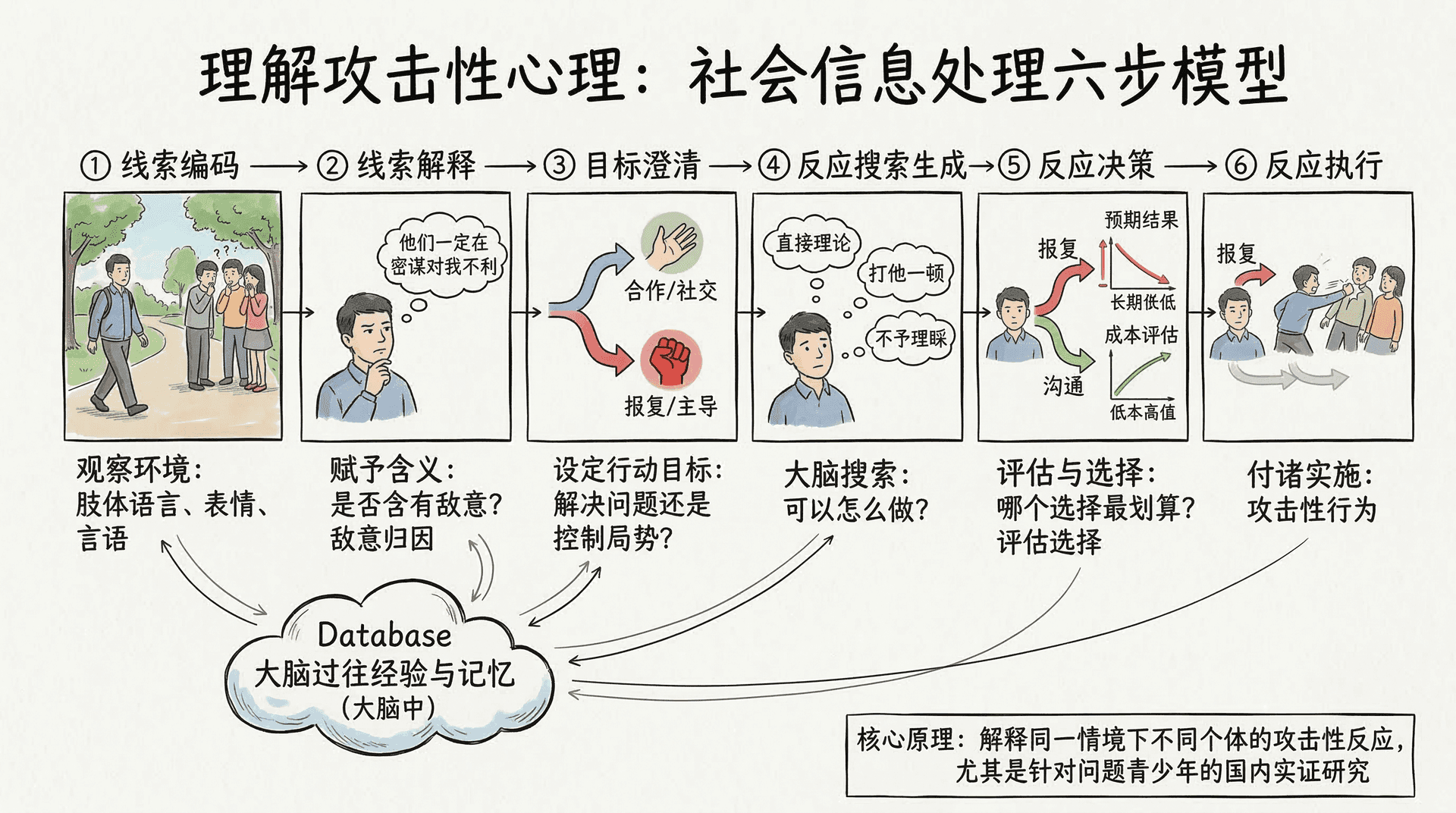 该模型按照信息流动的顺序,将社会信息的处理过程划分为六个相互衔接的步骤。每一步都可能出现偏差,而偏差的积累,最终会导致个体做出攻击性或反社会的行为选择。