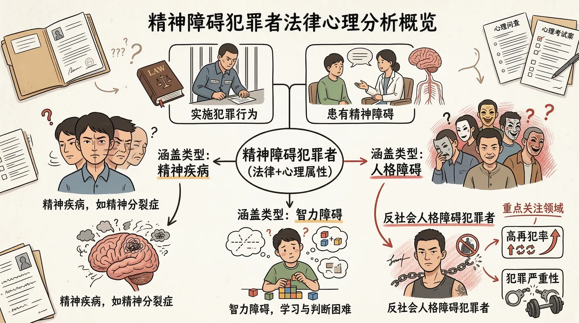 “精神障碍犯罪者”是一个兼具法律属性和心理学属性的概念,指那些患有精神障碍且实施了犯罪行为的个体。在我国《精神卫生法》的框架下,精神障碍被定义为精神功能方面的任何障碍或残疾。精神障碍类型涵盖精神疾病、智力障碍和人格障碍等多种情形,其中反社会人格障碍犯罪者因其高再犯率和犯罪严重性,尤其受到司法心理学领域的关注。