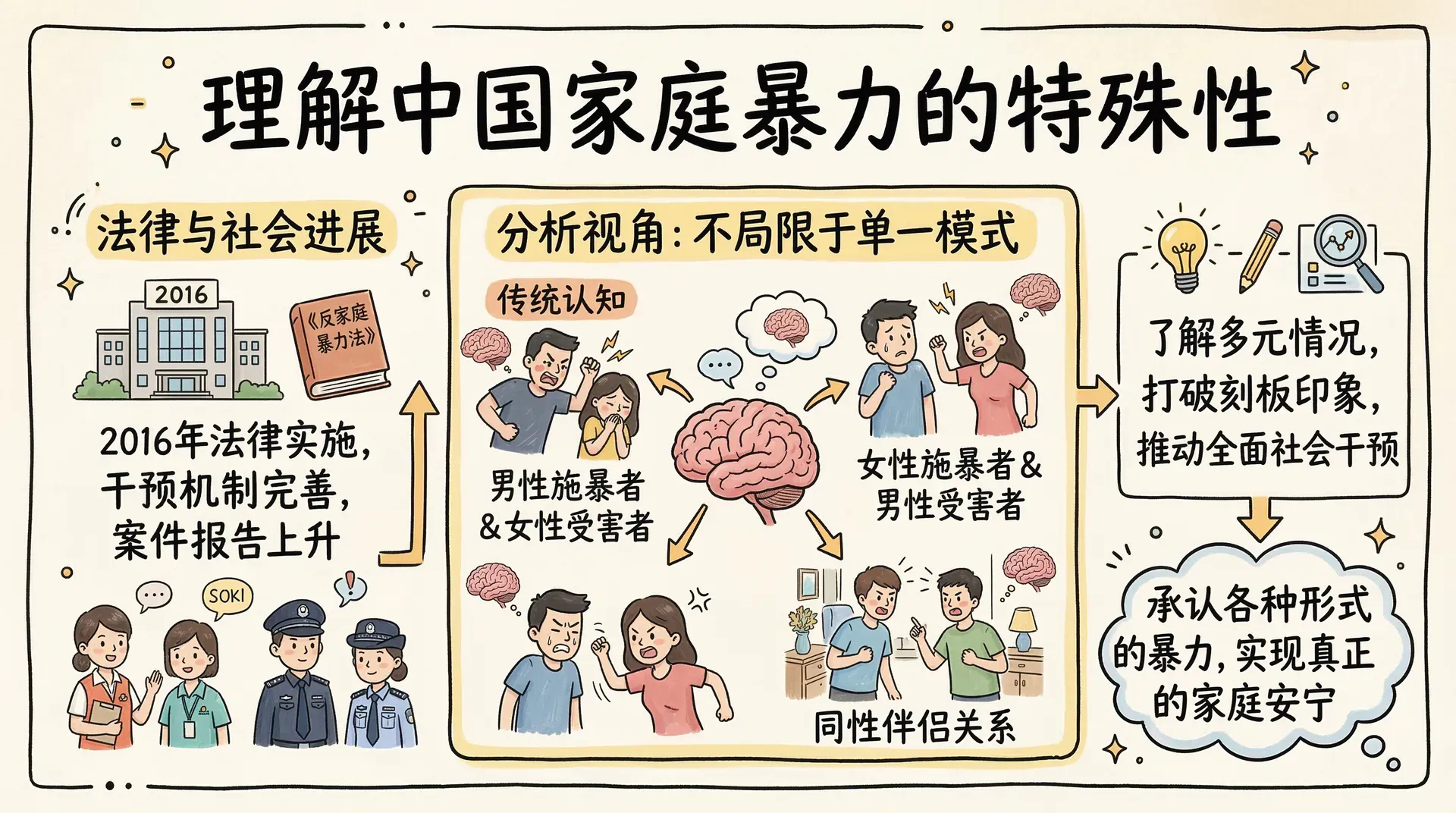 家庭暴力或亲密伴侣暴力是一个日益受到社会关注的问题。随着《反家庭暴力法》于2016年在中国正式实施,家庭暴力的法律认定和社会干预机制逐步完善,相关案件的报告数量也有所上升。虽然大多数研究关注男性施暴者和女性受害者,但家庭暴力同样可能发生在女性施暴者与男性受害者之间,以及同性伴侣关系中。