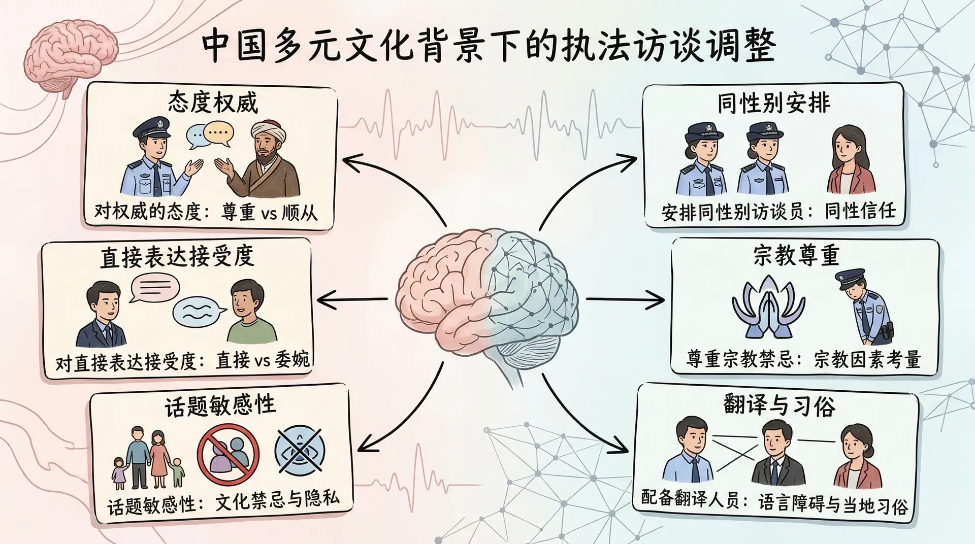 中国是一个多民族国家,访谈员在执法工作中经常面对来自不同文化背景的证人。文化差异可能影响证人对权威的态度、对直接表达的接受程度,以及对某些话题的敏感性。