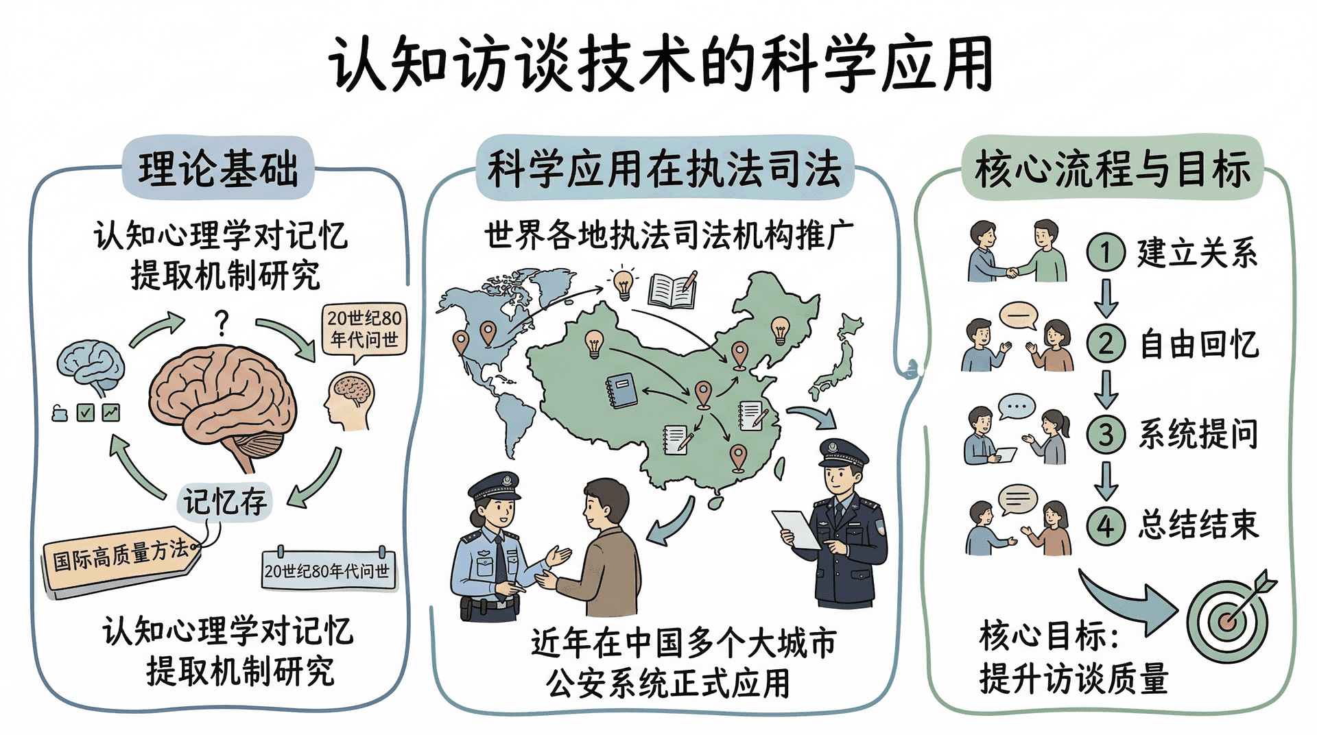 认知访谈是目前国际上公认的高质量访谈方法之一,其理论基础来自认知心理学对记忆提取机制的研究。自20世纪80年代问世以来,这套方法在世界各地的执法部门和司法机构中得到推广,近年来在中国多个大城市的公安系统中也开始正式应用。了解认知访谈的原理和流程,是提升访谈质量的重要基础。