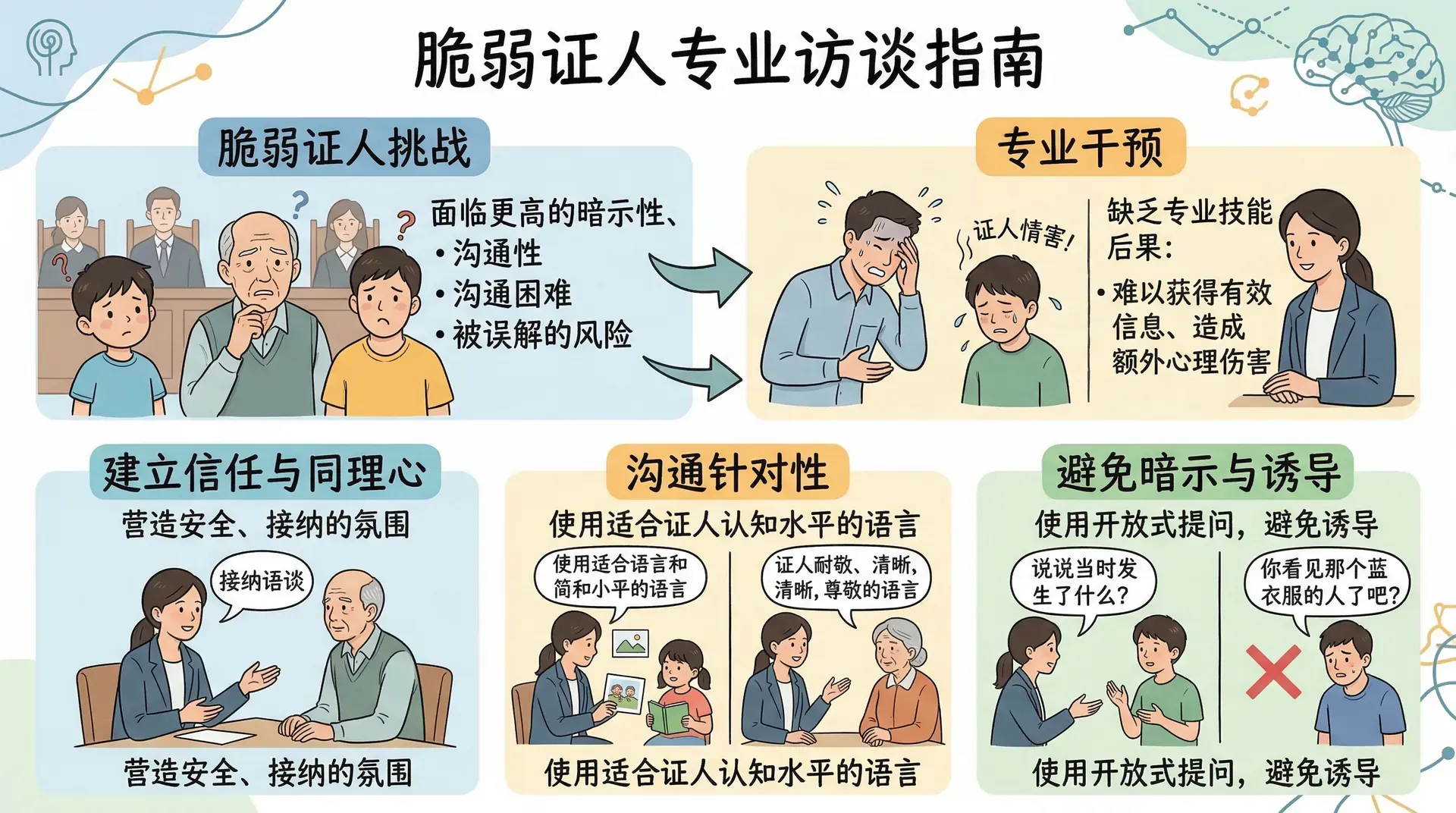 调查访谈面对的对象千差万别,其中一类需要特别关注的群体被称为“脆弱证人”,包括儿童、老年人,以及患有智力或发育障碍的个体。这类证人在法律环境中面临更高的暗示性、沟通困难或被误解的风险,若访谈员缺乏针对性的专业技能,不仅难以获得有效信息,还可能给证人造成额外的心理伤害。