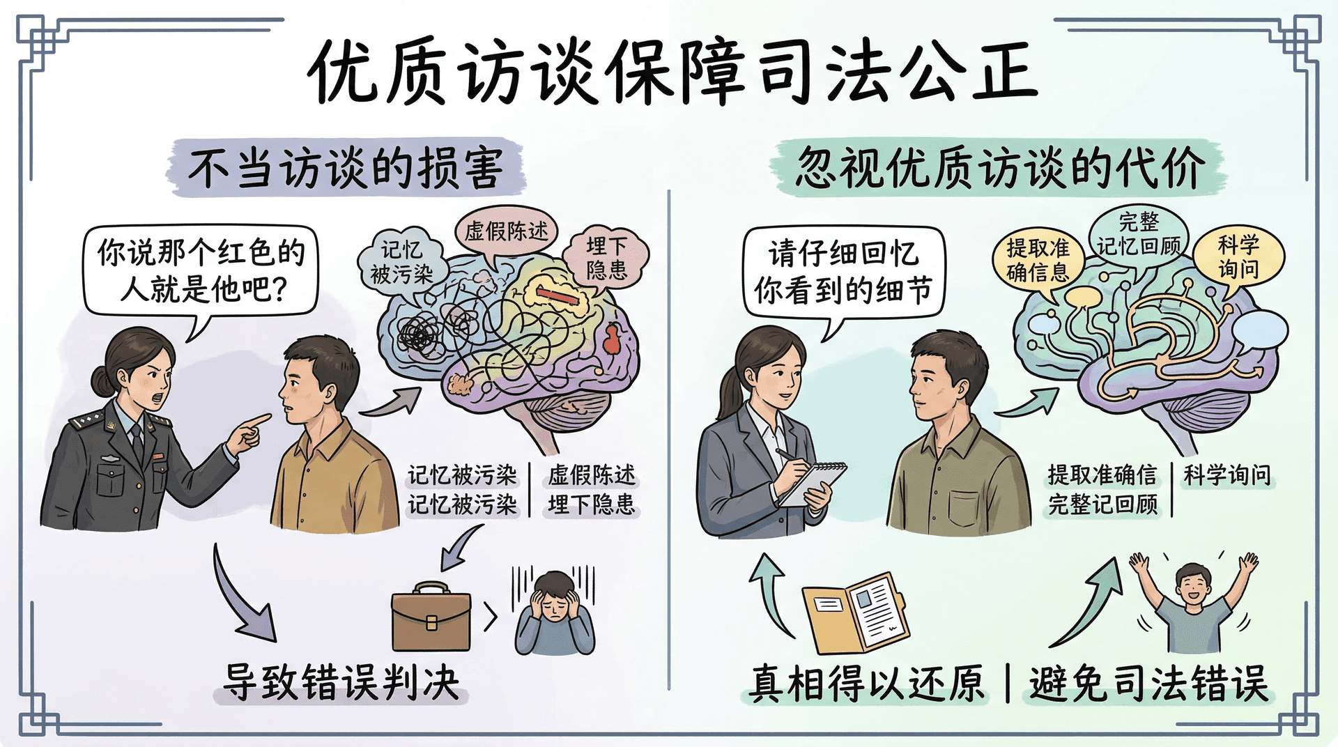 访谈质量往往直接决定案件的走向。一次好的访谈,能够帮助证人从记忆深处提取出准确、完整的信息;而一次充满引导性和暗示性的访谈,则可能污染证人的记忆,为案件埋下隐患。理解访谈质量为何如此重要,需要从两个方向来看:不当访谈会造成什么损害,以及忽视高质量访谈又会付出怎样的代价。